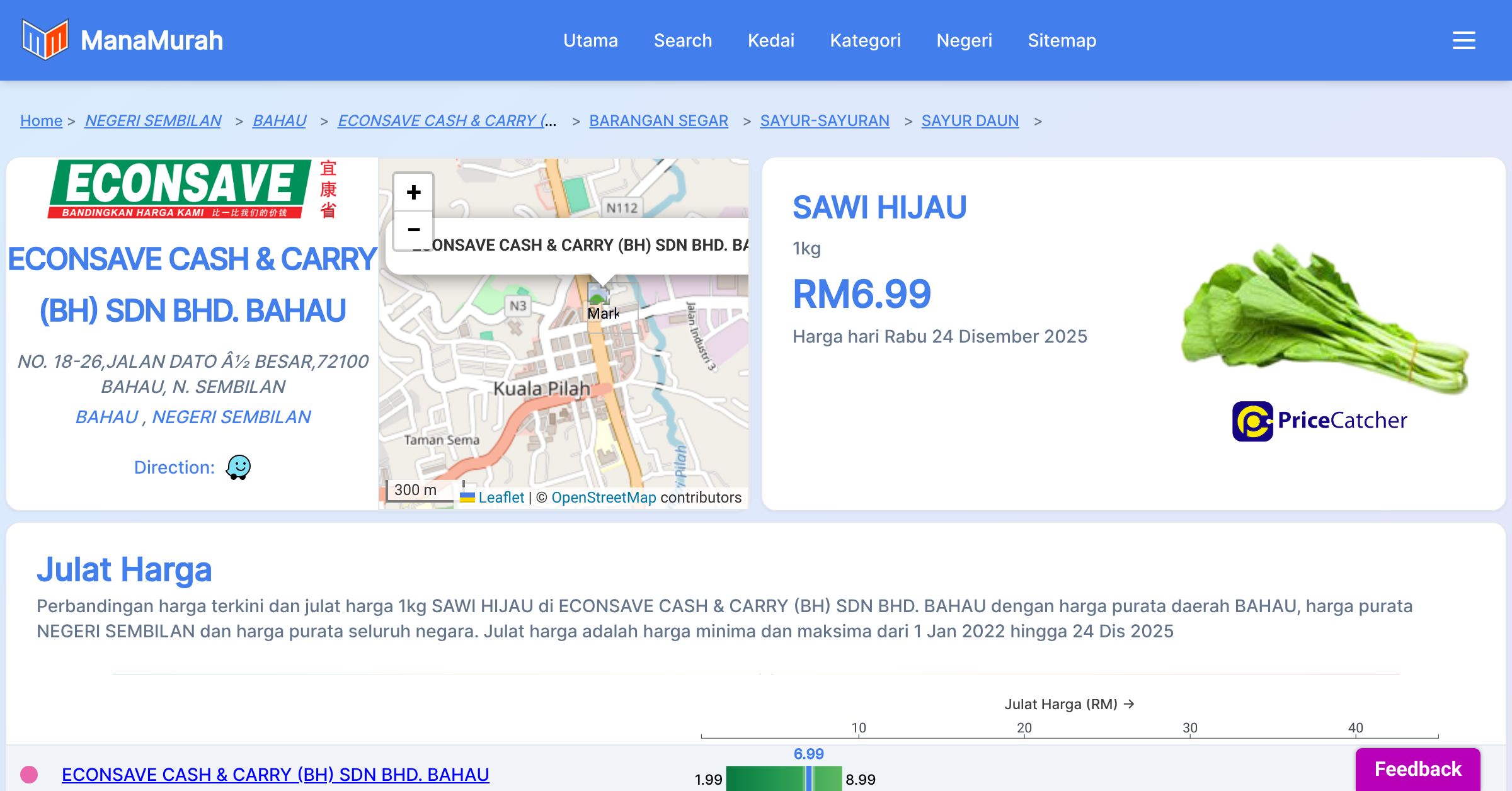 Perubahan harga purata mingguan 1kg SAWI HIJAU di ECONSAVE CASH & CARRY (BH) SDN BHD. BAHAU berbanding harga purata mingguan daerah BAHAU, harga purata mingguan negeri NEGERI SEMBILAN dan harga purata mingguan seluruh negara sehingga 24 Dis 2025