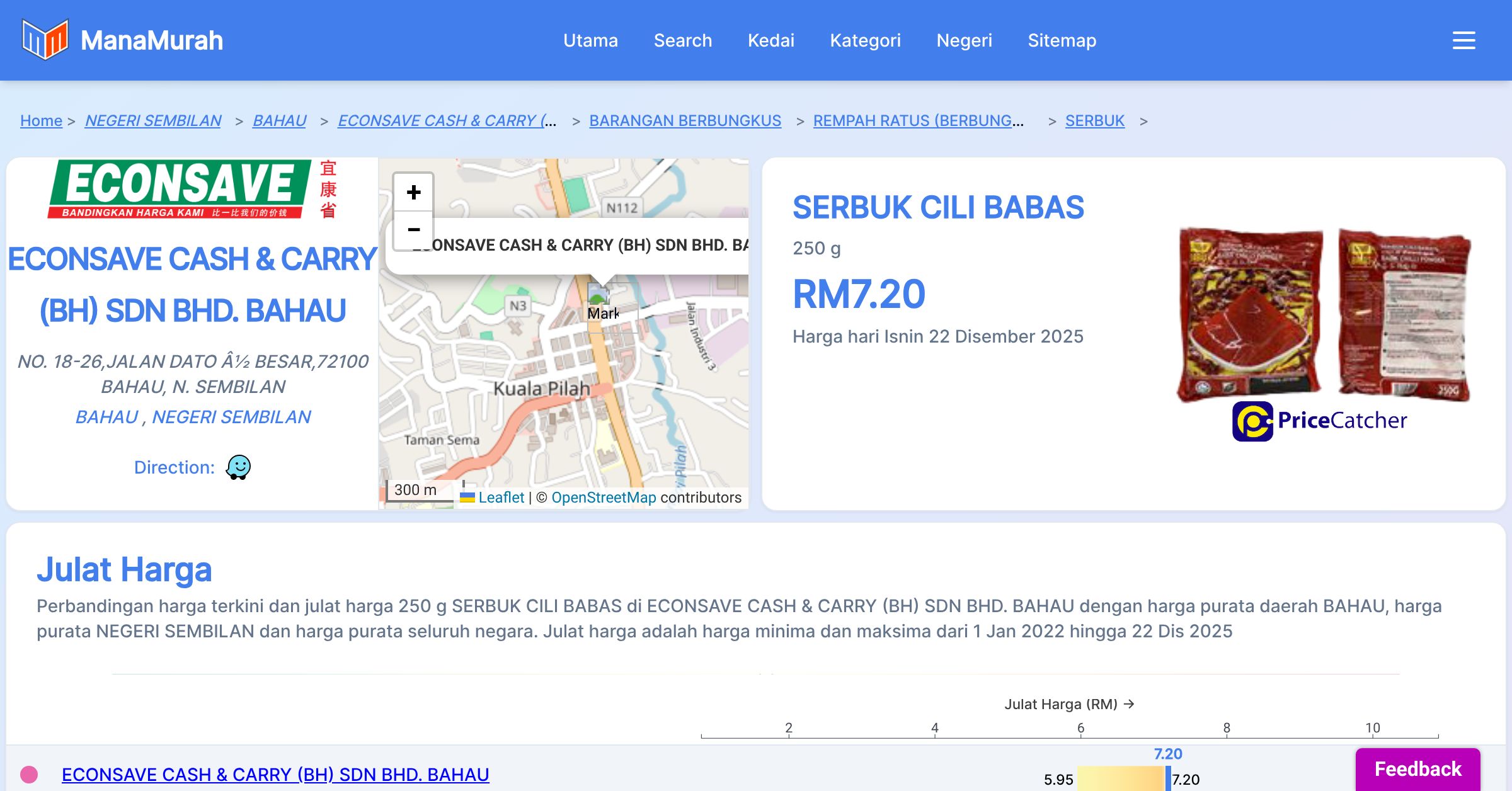 Perbandingan harga terkini dan julat harga 250 g SERBUK CILI BABAS di ECONSAVE CASH & CARRY (BH) SDN BHD. BAHAU dengan harga purata daerah BAHAU, harga purata NEGERI SEMBILAN dan harga purata seluruh negara. Julat harga adalah harga minima dan maksima dari 1 Jan 2022 hingga 22 Dis 2025