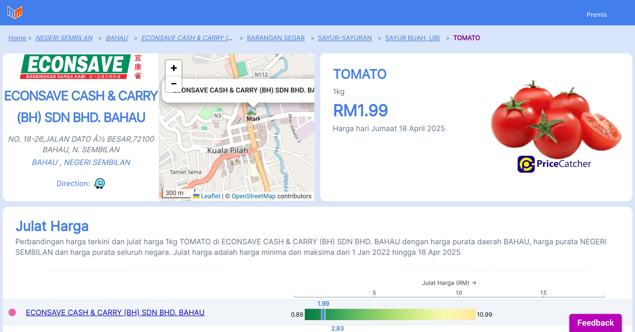 Harga purata tahunan 1kg TOMATO di ECONSAVE CASH & CARRY (BH) SDN BHD. BAHAU berbanding harga purata daerah BAHAU, harga purata NEGERI SEMBILAN dan harga purata seluruh negara