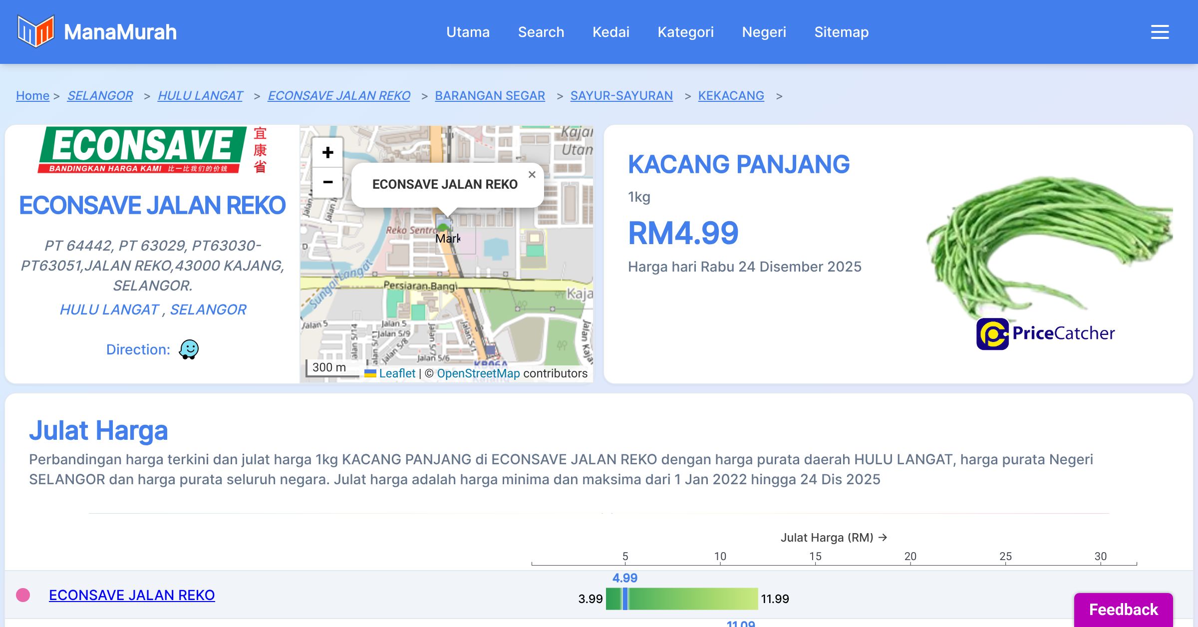 Harga purata bulanan 1kg KACANG PANJANG di ECONSAVE JALAN REKO berbanding harga purata daerah HULU LANGAT, harga purata Negeri SELANGOR dan harga purata seluruh negara