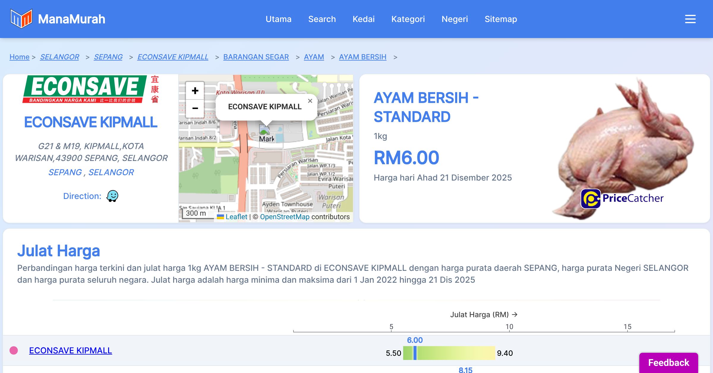 Perbandingan harga terkini dan julat harga 1kg AYAM BERSIH - STANDARD di ECONSAVE KIPMALL dengan harga purata daerah SEPANG, harga purata Negeri SELANGOR dan harga purata seluruh negara. Julat harga adalah harga minima dan maksima dari 1 Jan 2022 hingga 21 Dis 2025