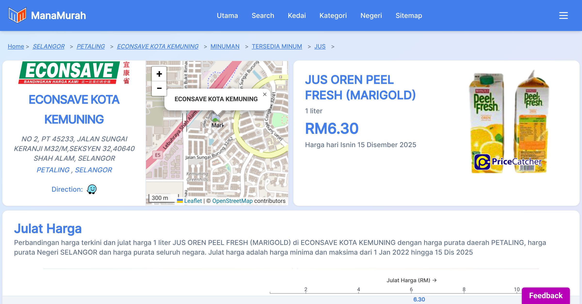 Perubahan harga purata mingguan 1 liter JUS OREN PEEL FRESH (MARIGOLD) di ECONSAVE KOTA KEMUNING berbanding harga purata mingguan daerah PETALING, harga purata mingguan negeri SELANGOR dan harga purata mingguan seluruh negara sehingga 15 Dis 2025