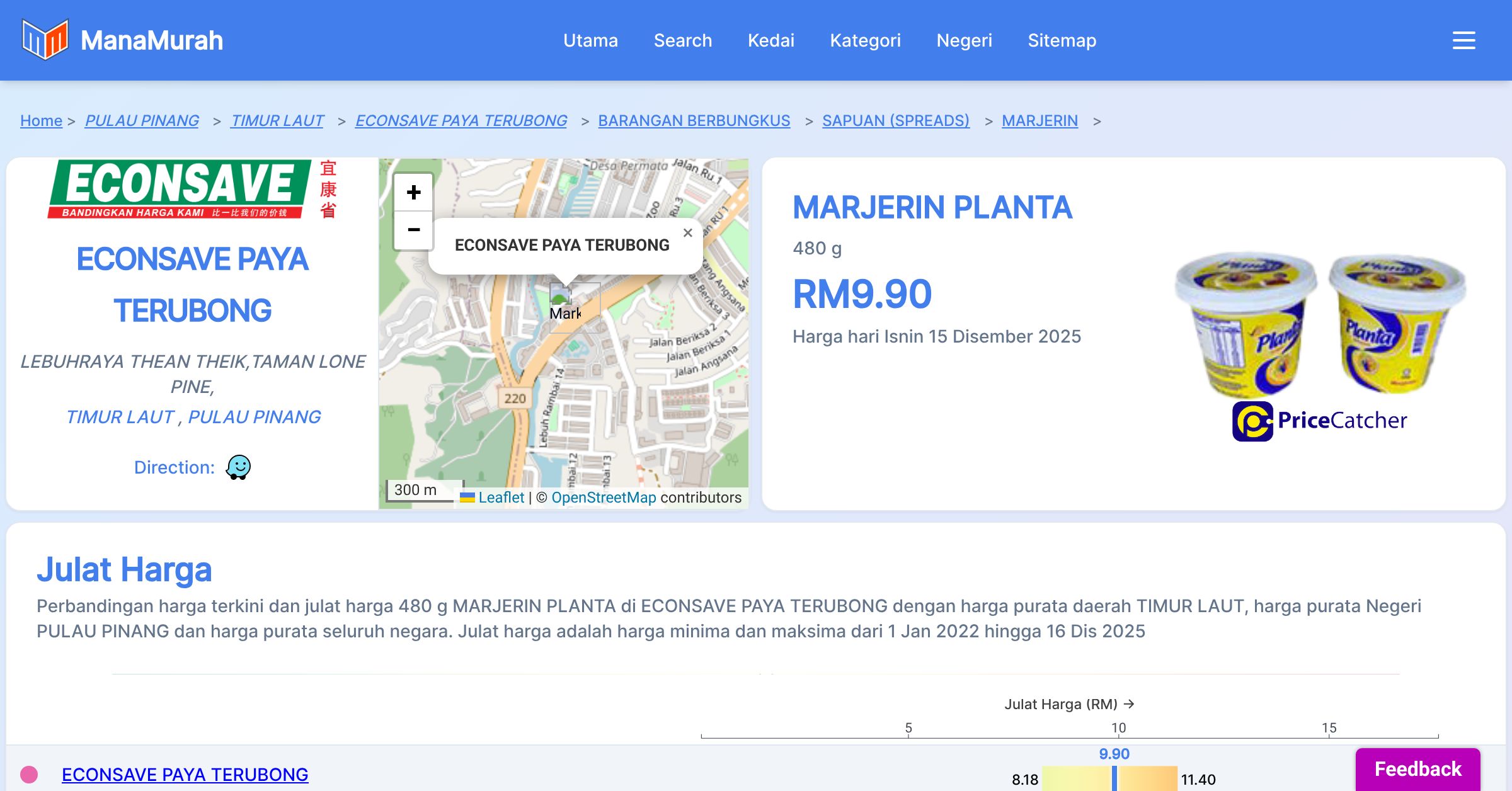 Perbandingan harga terkini dan julat harga 480 g MARJERIN PLANTA di ECONSAVE PAYA TERUBONG dengan harga purata daerah TIMUR LAUT, harga purata Negeri PULAU PINANG dan harga purata seluruh negara. Julat harga adalah harga minima dan maksima dari 1 Jan 2022 hingga 16 Dis 2025
