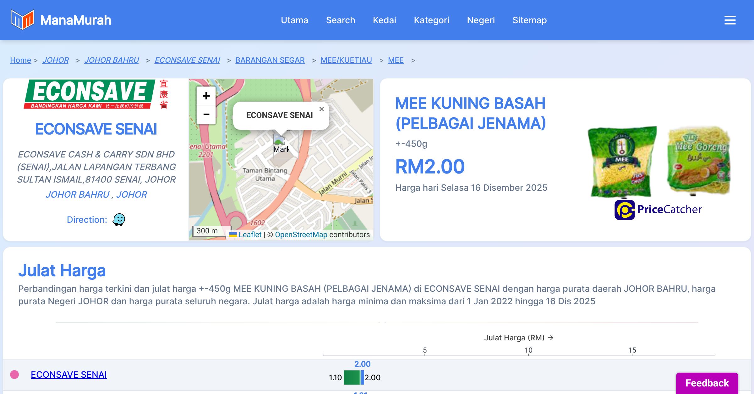 Perubahan harga purata mingguan +-450g MEE KUNING BASAH (PELBAGAI JENAMA) di ECONSAVE SENAI berbanding harga purata mingguan daerah JOHOR BAHRU, harga purata mingguan negeri JOHOR dan harga purata mingguan seluruh negara sehingga 16 Dis 2025