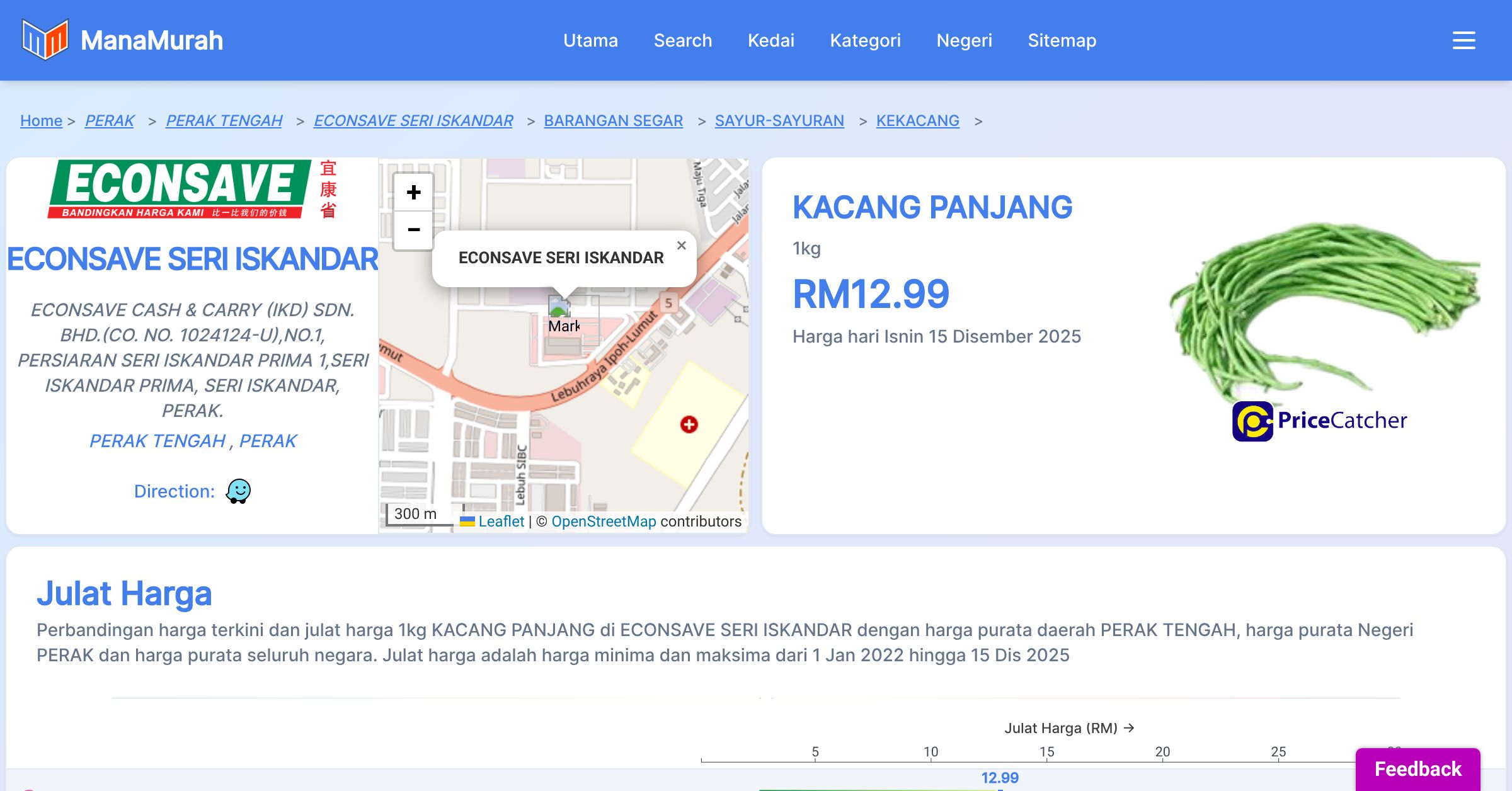 Perubahan harga purata mingguan 1kg KACANG PANJANG di ECONSAVE SERI ISKANDAR berbanding harga purata mingguan daerah PERAK TENGAH, harga purata mingguan negeri PERAK dan harga purata mingguan seluruh negara sehingga 15 Dis 2025