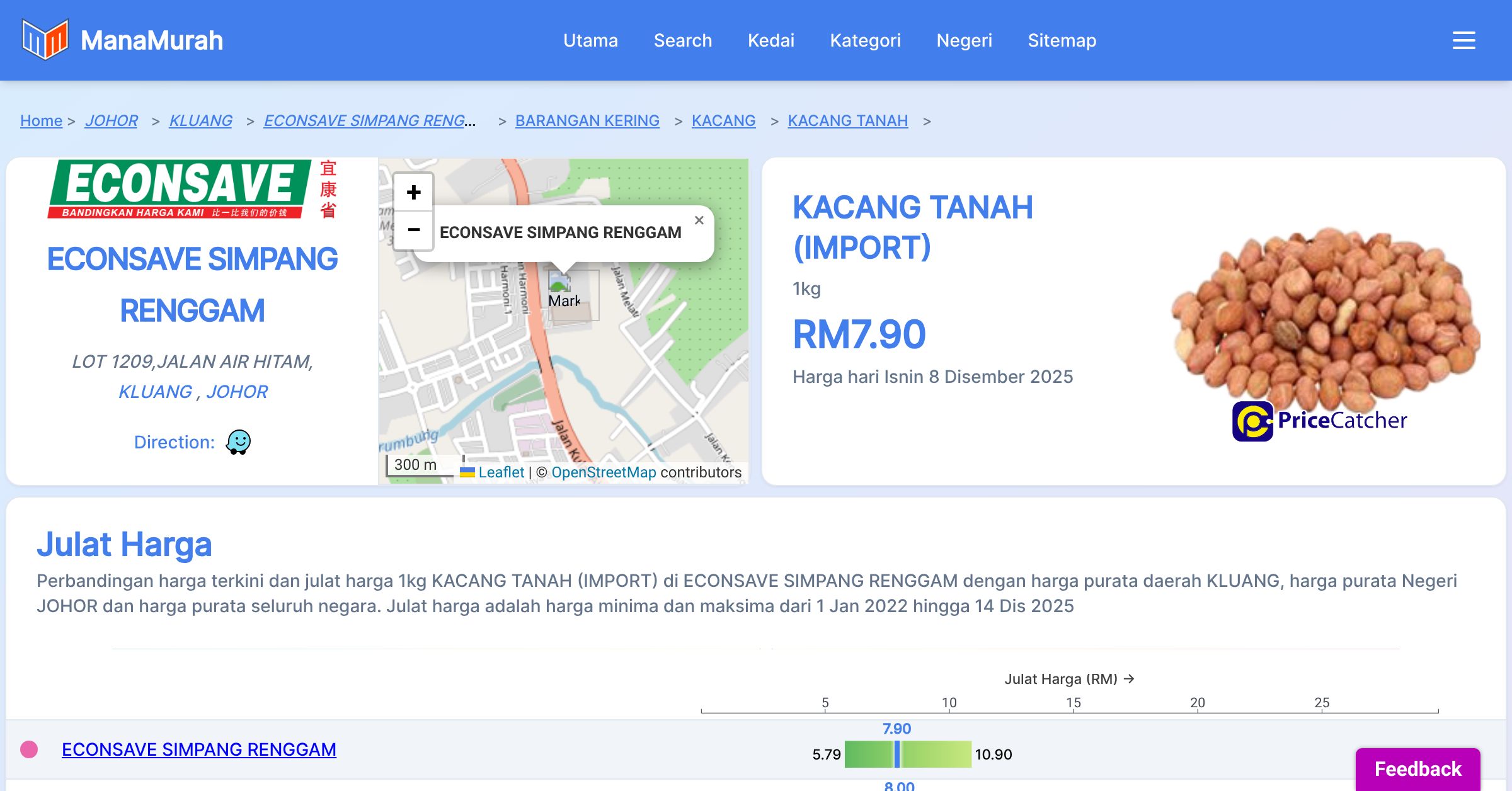 Perubahan harga purata mingguan 1kg KACANG TANAH (IMPORT) di ECONSAVE SIMPANG RENGGAM berbanding harga purata mingguan daerah KLUANG, harga purata mingguan negeri JOHOR dan harga purata mingguan seluruh negara sehingga 8 Dis 2025