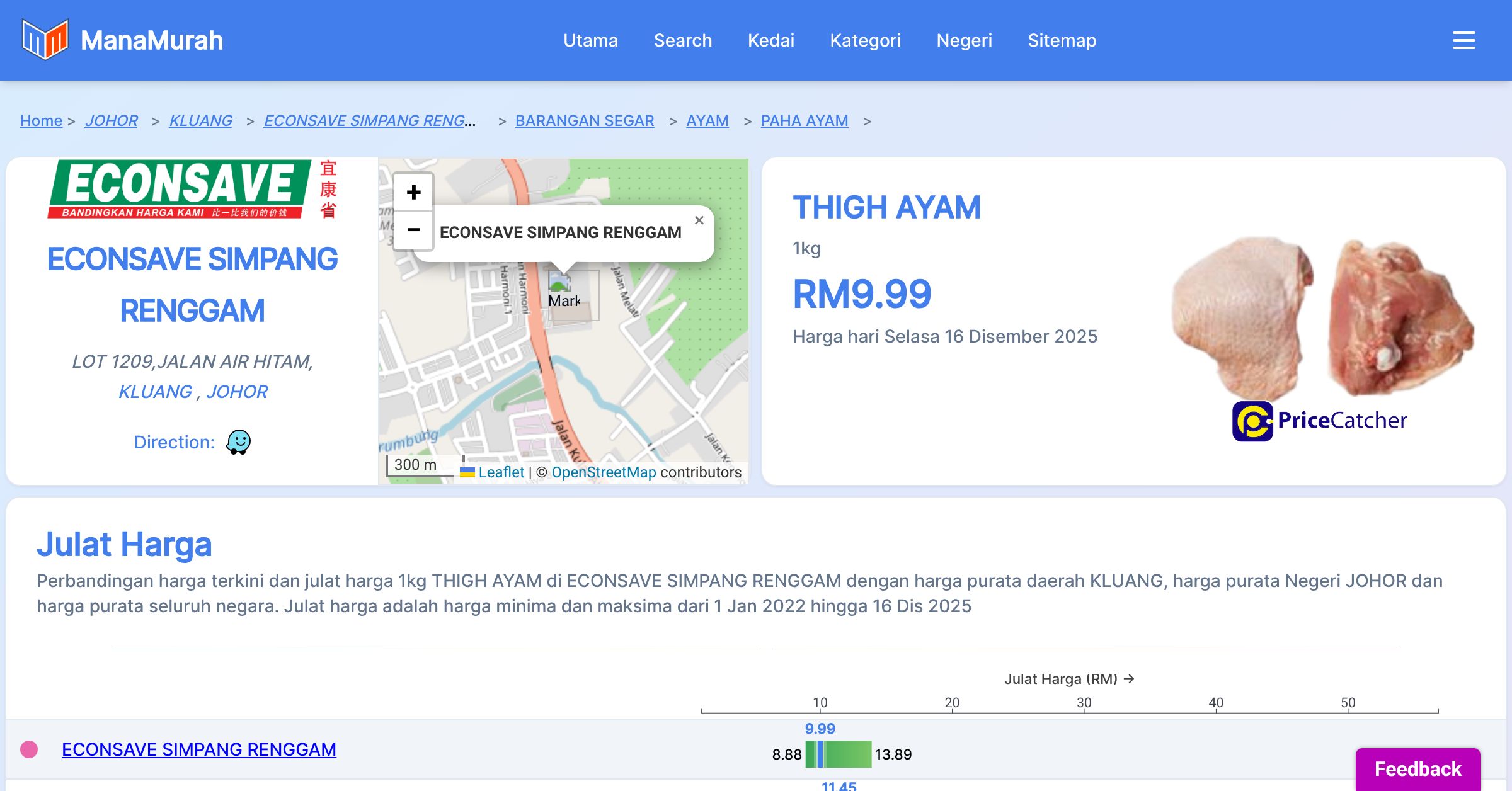 Perbandingan harga terkini dan julat harga 1kg THIGH AYAM di ECONSAVE SIMPANG RENGGAM dengan harga purata daerah KLUANG, harga purata Negeri JOHOR dan harga purata seluruh negara. Julat harga adalah harga minima dan maksima dari 1 Jan 2022 hingga 16 Dis 2025