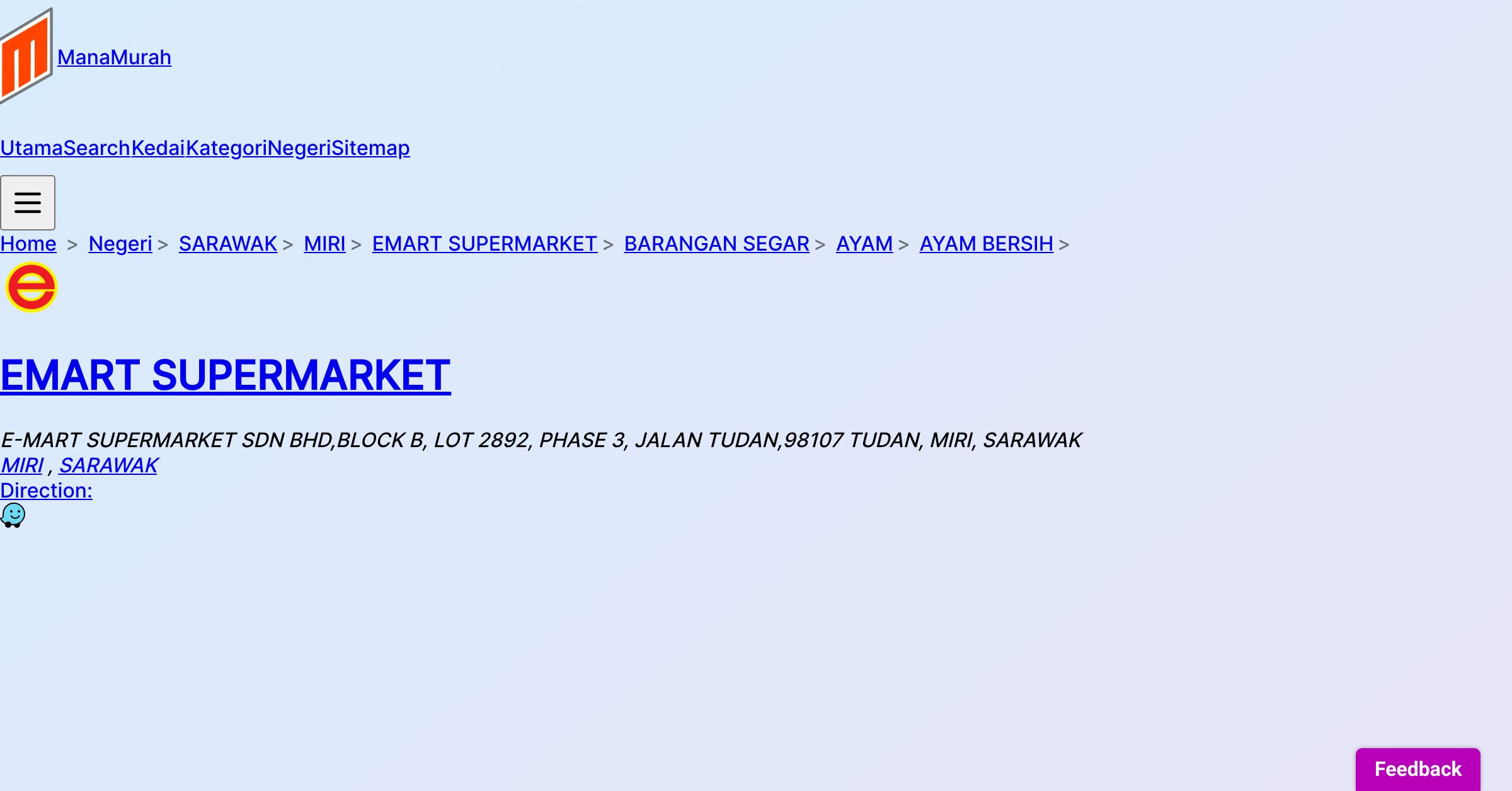 E-MART SUPERMARKET SDN BHD,BLOCK B, LOT 2892, PHASE 3, JALAN TUDAN,98107 TUDAN, MIRI, SARAWAK