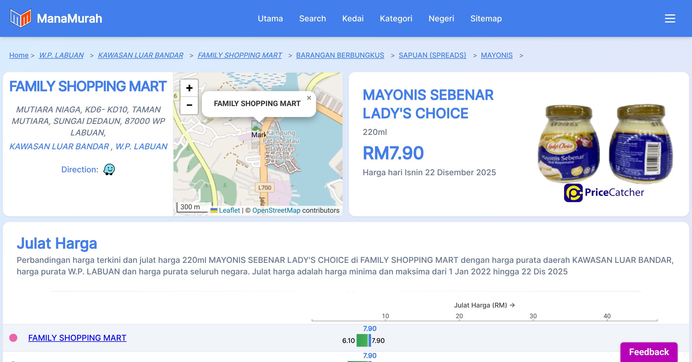 Perubahan harga purata mingguan 220ml MAYONIS SEBENAR LADY'S CHOICE di FAMILY SHOPPING MART berbanding harga purata mingguan daerah KAWASAN LUAR BANDAR, harga purata mingguan negeri W.P. LABUAN dan harga purata mingguan seluruh negara sehingga 22 Dis 2025