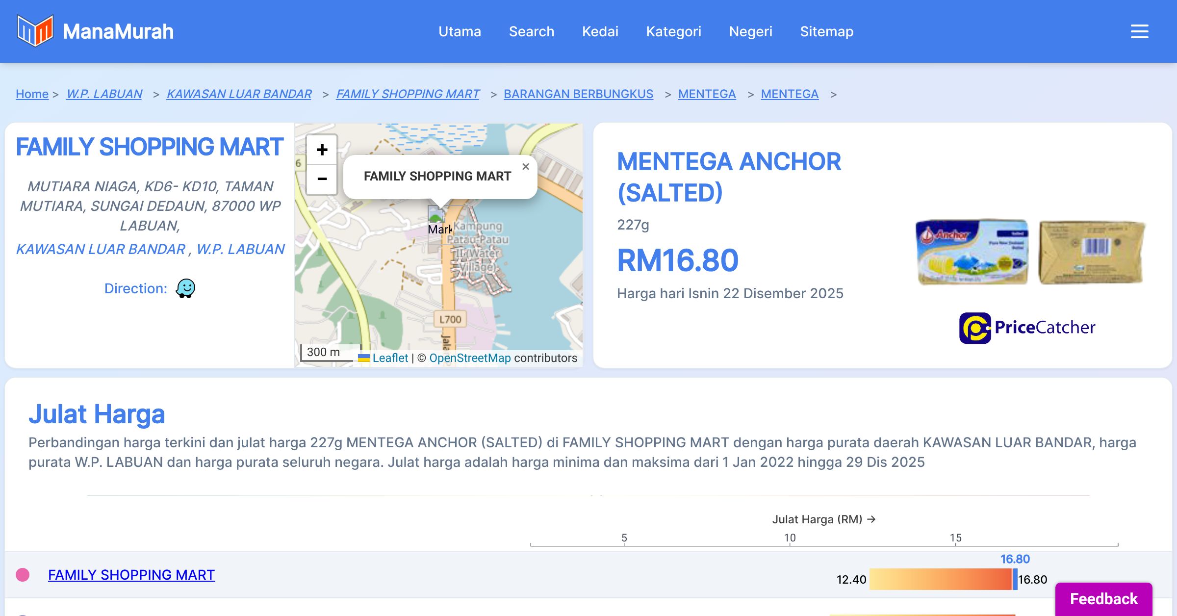 Harga purata mingguan 227g MENTEGA ANCHOR (SALTED) di FAMILY SHOPPING MART berbanding harga purata daerah KAWASAN LUAR BANDAR, harga purata W.P. LABUAN dan harga purata seluruh negara