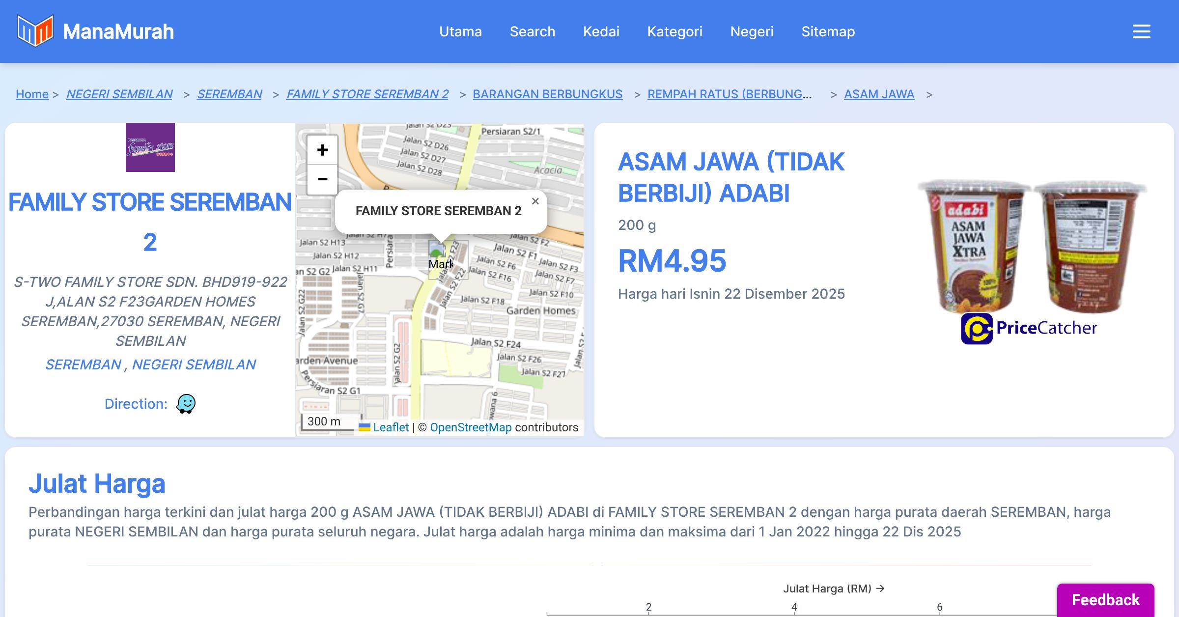 Perubahan harga purata mingguan 200 g ASAM JAWA (TIDAK BERBIJI) ADABI di FAMILY STORE SEREMBAN 2 berbanding harga purata mingguan daerah SEREMBAN, harga purata mingguan negeri NEGERI SEMBILAN dan harga purata mingguan seluruh negara sehingga 22 Dis 2025