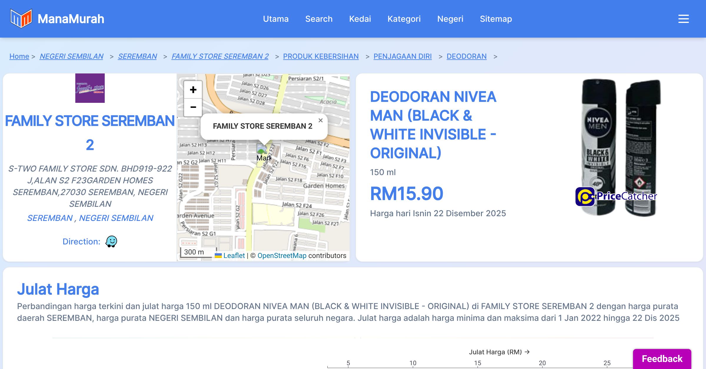Perubahan harga purata mingguan 150 ml DEODORAN NIVEA MAN (BLACK & WHITE INVISIBLE - ORIGINAL) di FAMILY STORE SEREMBAN 2 berbanding harga purata mingguan daerah SEREMBAN, harga purata mingguan negeri NEGERI SEMBILAN dan harga purata mingguan seluruh negara sehingga 22 Dis 2025