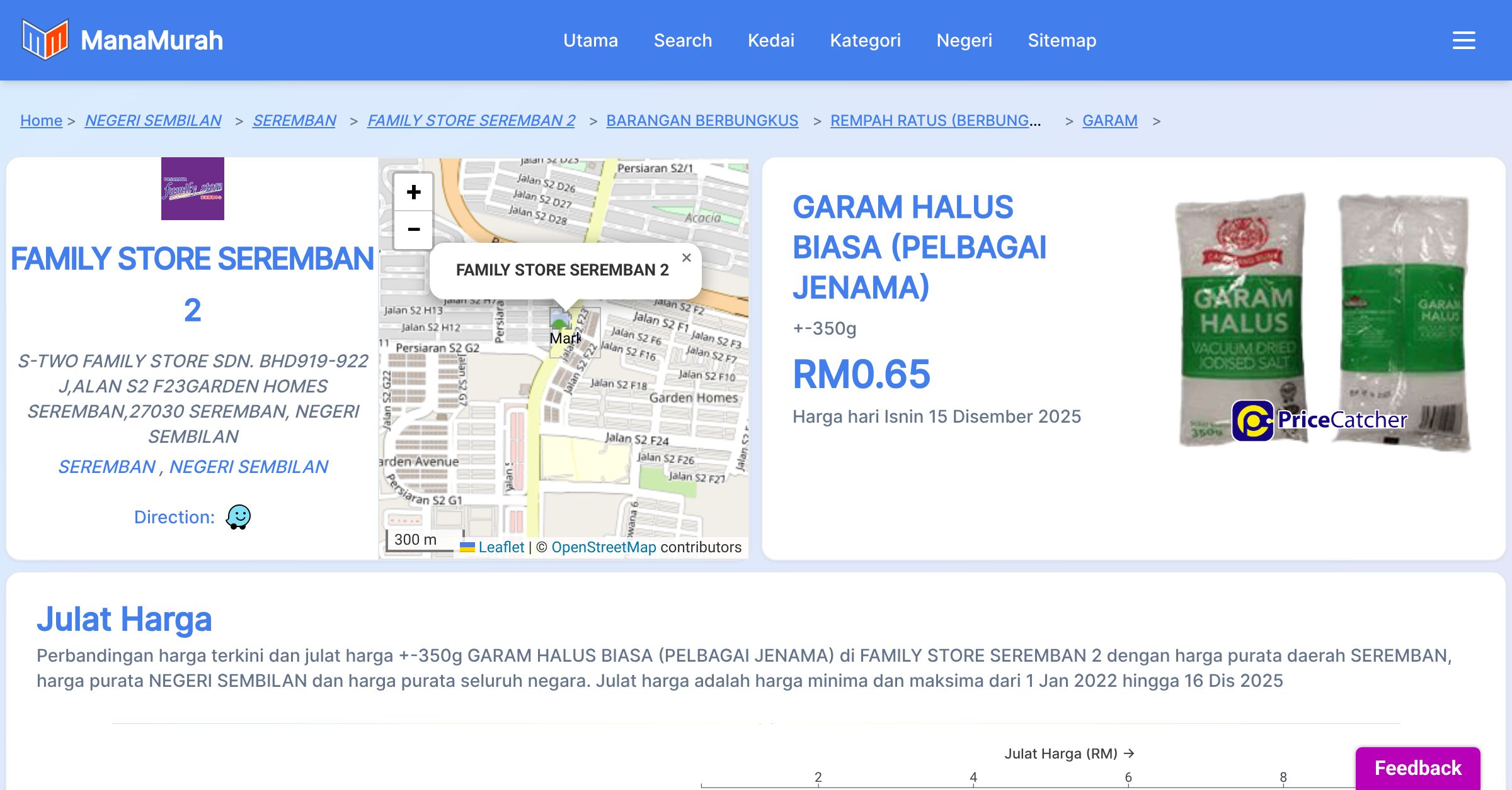 Perubahan harga purata mingguan +-350g GARAM HALUS BIASA (PELBAGAI JENAMA) di FAMILY STORE SEREMBAN 2 berbanding harga purata mingguan daerah SEREMBAN, harga purata mingguan negeri NEGERI SEMBILAN dan harga purata mingguan seluruh negara sehingga 16 Dis 2025
