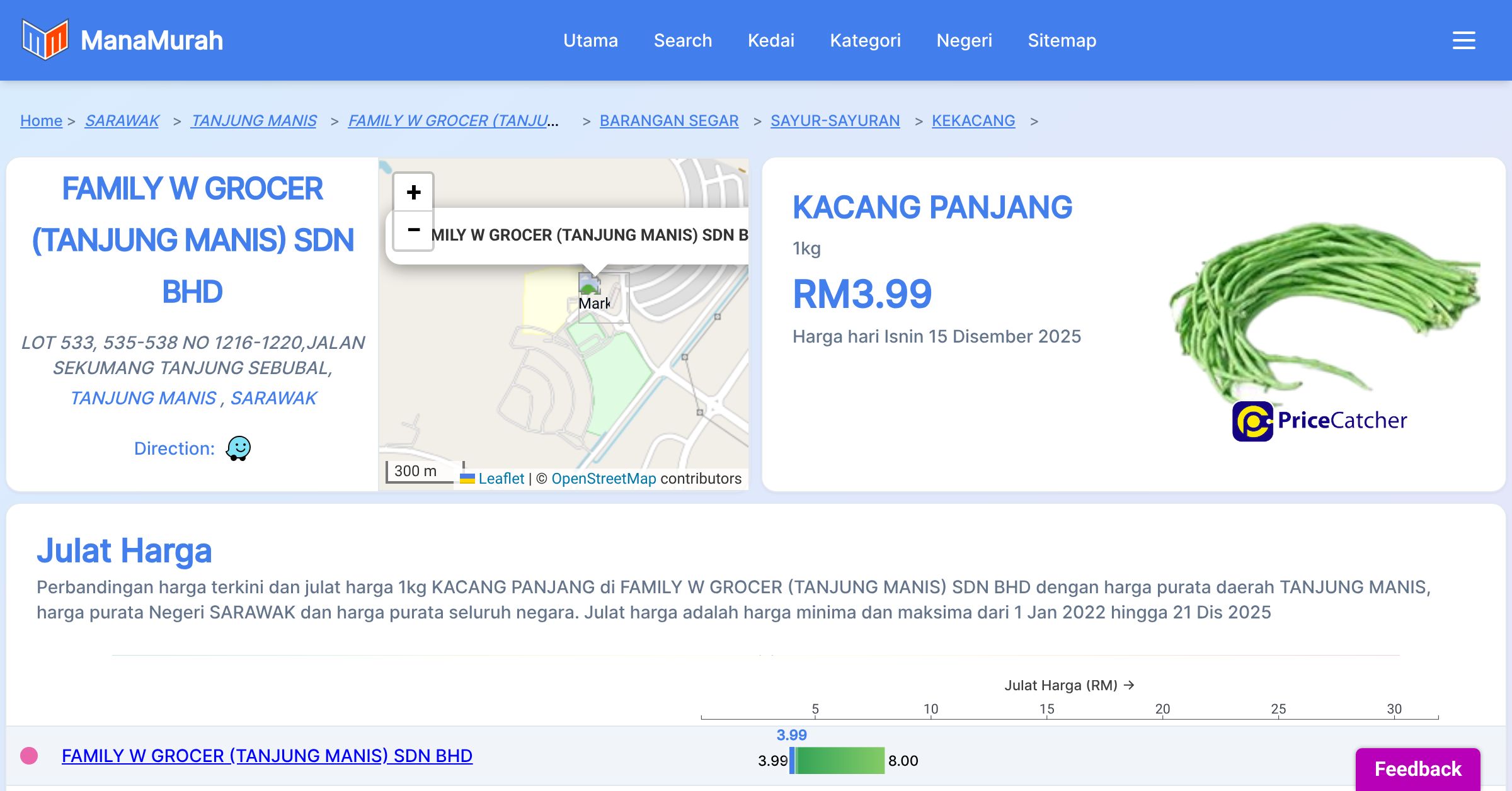 Harga purata bulanan 1kg KACANG PANJANG di FAMILY W GROCER (TANJUNG MANIS) SDN BHD berbanding harga purata daerah TANJUNG MANIS, harga purata Negeri SARAWAK dan harga purata seluruh negara