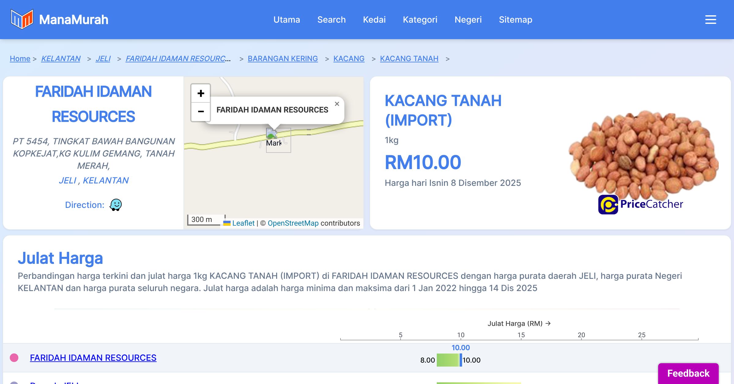 Perbandingan harga terkini dan julat harga 1kg KACANG TANAH (IMPORT) di FARIDAH IDAMAN RESOURCES dengan harga purata daerah JELI, harga purata Negeri KELANTAN dan harga purata seluruh negara. Julat harga adalah harga minima dan maksima dari 1 Jan 2022 hingga 14 Dis 2025