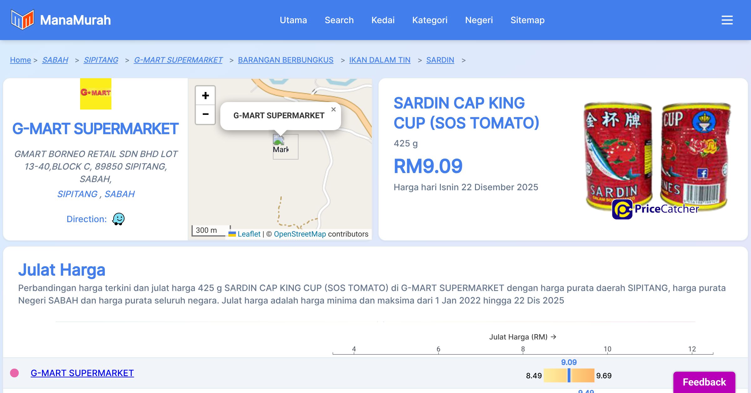 Perbandingan harga terkini dan julat harga 425 g SARDIN CAP KING CUP (SOS TOMATO) di G-MART SUPERMARKET dengan harga purata daerah SIPITANG, harga purata Negeri SABAH dan harga purata seluruh negara. Julat harga adalah harga minima dan maksima dari 1 Jan 2022 hingga 22 Dis 2025