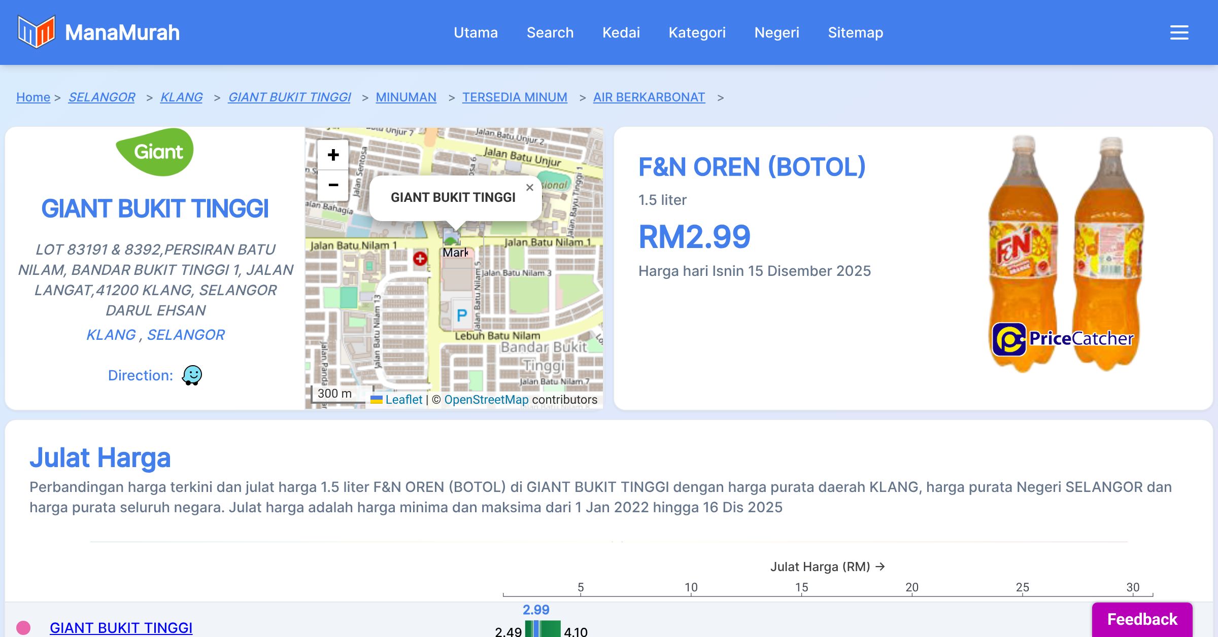 Harga purata tahunan 1.5 liter F&N OREN (BOTOL) di GIANT BUKIT TINGGI berbanding harga purata daerah KLANG, harga purata Negeri SELANGOR dan harga purata seluruh negara