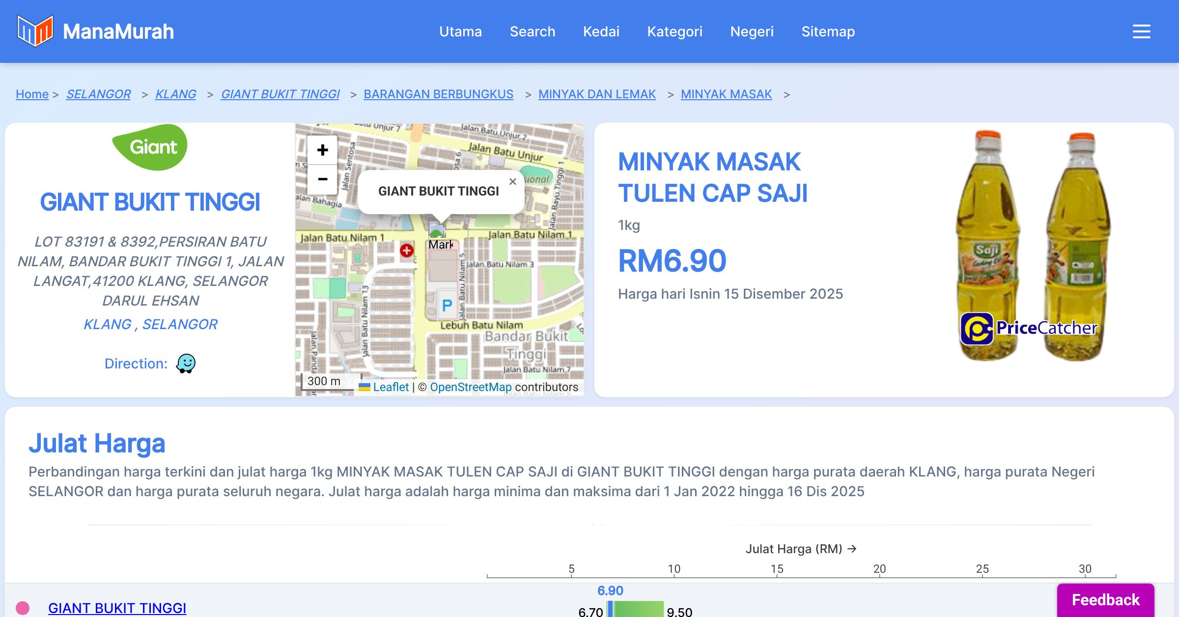 Harga purata bulanan 1kg MINYAK MASAK TULEN CAP SAJI di GIANT BUKIT TINGGI berbanding harga purata daerah KLANG, harga purata Negeri SELANGOR dan harga purata seluruh negara