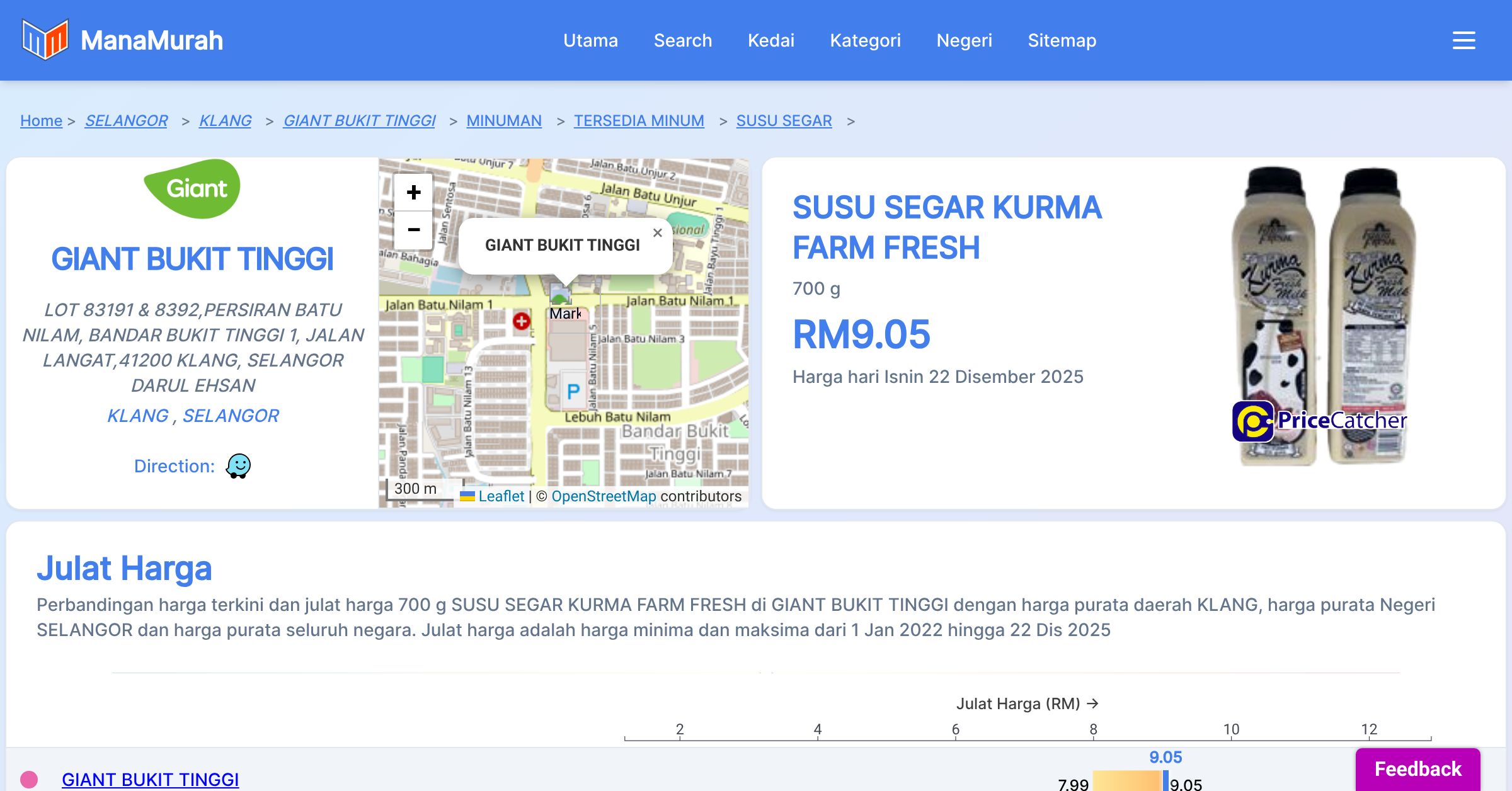Harga purata tahunan 700 g SUSU SEGAR KURMA FARM FRESH di GIANT BUKIT TINGGI berbanding harga purata daerah KLANG, harga purata Negeri SELANGOR dan harga purata seluruh negara