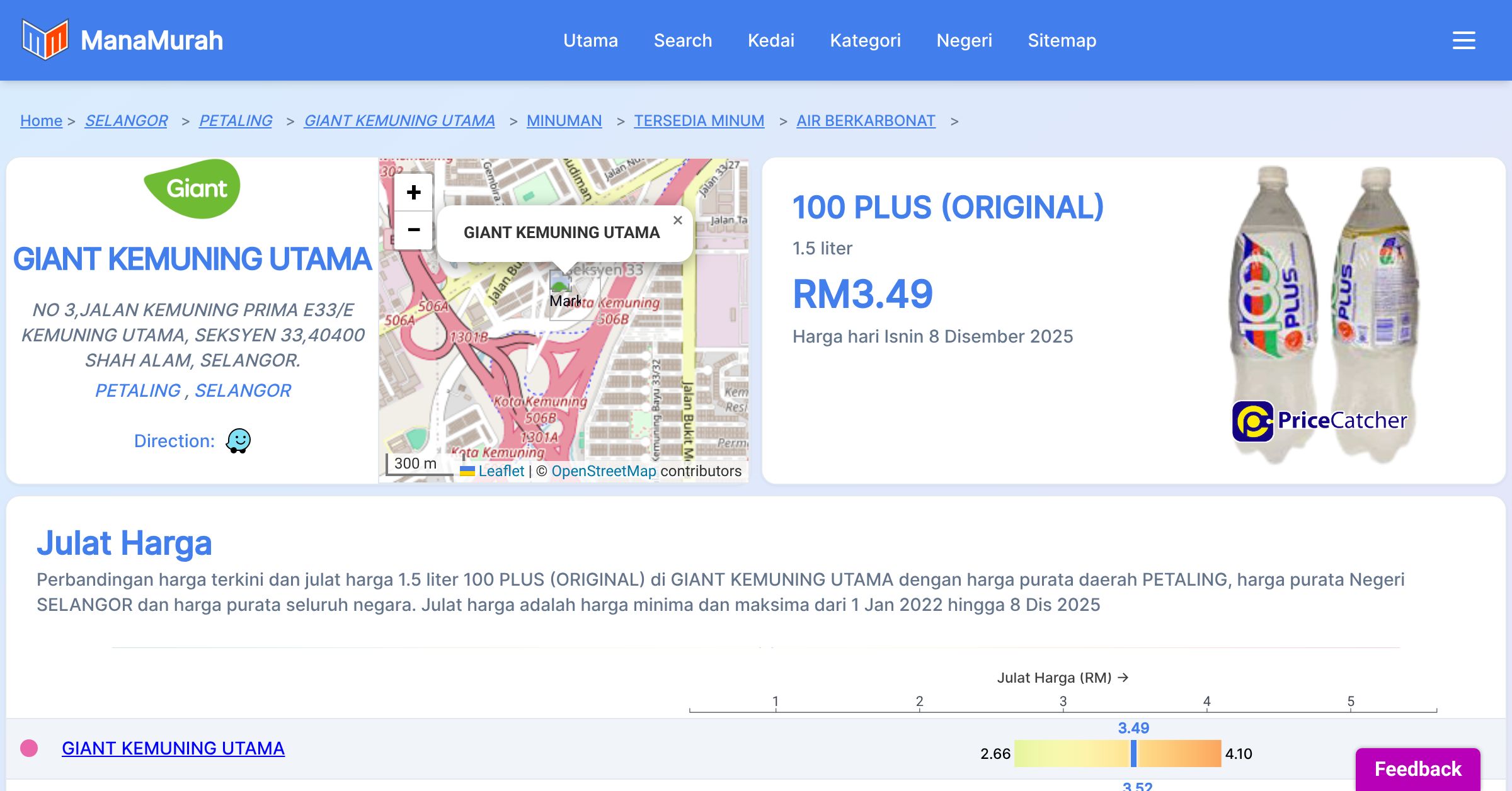 Perbandingan harga terkini dan julat harga 1.5 liter 100 PLUS (ORIGINAL) di GIANT KEMUNING UTAMA dengan harga purata daerah PETALING, harga purata Negeri SELANGOR dan harga purata seluruh negara. Julat harga adalah harga minima dan maksima dari 1 Jan 2022 hingga 8 Dis 2025