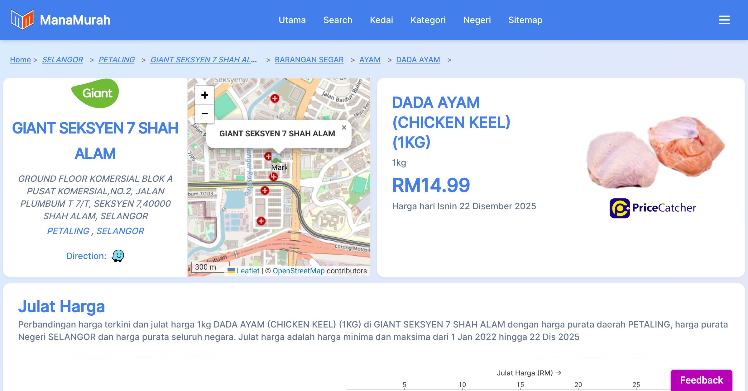 Perubahan harga purata mingguan 1kg DADA AYAM (CHICKEN KEEL) (1KG) di GIANT SEKSYEN 7 SHAH ALAM berbanding harga purata mingguan daerah PETALING, harga purata mingguan negeri SELANGOR dan harga purata mingguan seluruh negara sehingga 22 Dis 2025