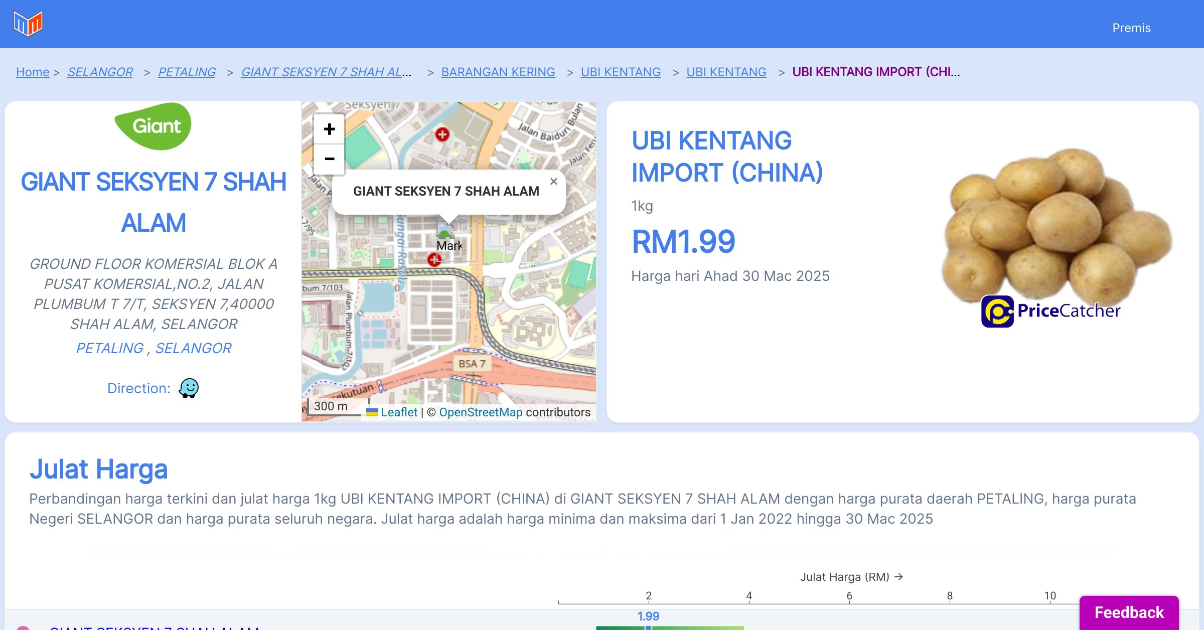 Harga purata tahunan 1kg UBI KENTANG IMPORT (CHINA) di GIANT SEKSYEN 7 SHAH ALAM berbanding harga purata daerah PETALING, harga purata Negeri SELANGOR dan harga purata seluruh negara