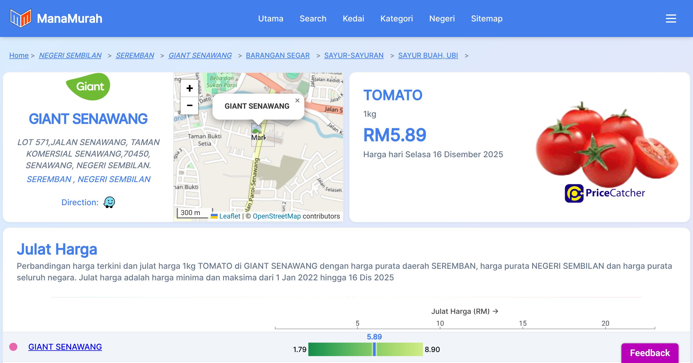 Perbandingan harga terkini dan julat harga 1kg TOMATO di GIANT SENAWANG dengan harga purata daerah SEREMBAN, harga purata NEGERI SEMBILAN dan harga purata seluruh negara. Julat harga adalah harga minima dan maksima dari 1 Jan 2022 hingga 16 Dis 2025