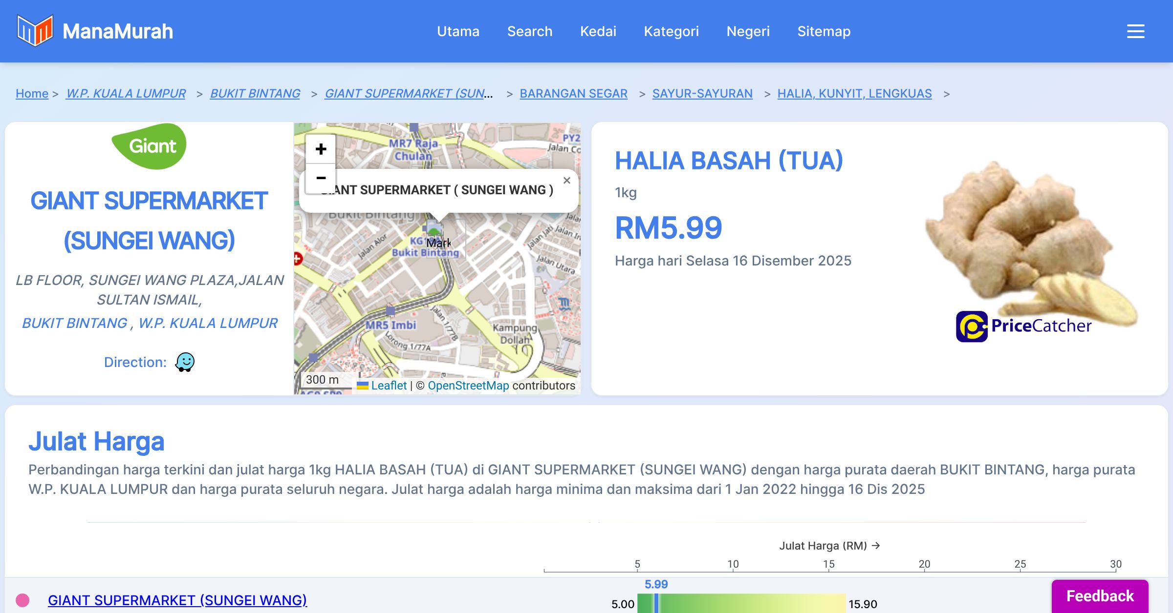 Perubahan harga purata mingguan 1kg HALIA BASAH (TUA) di GIANT SUPERMARKET ( SUNGEI WANG ) berbanding harga purata mingguan daerah BUKIT BINTANG, harga purata mingguan negeri W.P. KUALA LUMPUR dan harga purata mingguan seluruh negara sehingga 16 Dis 2025