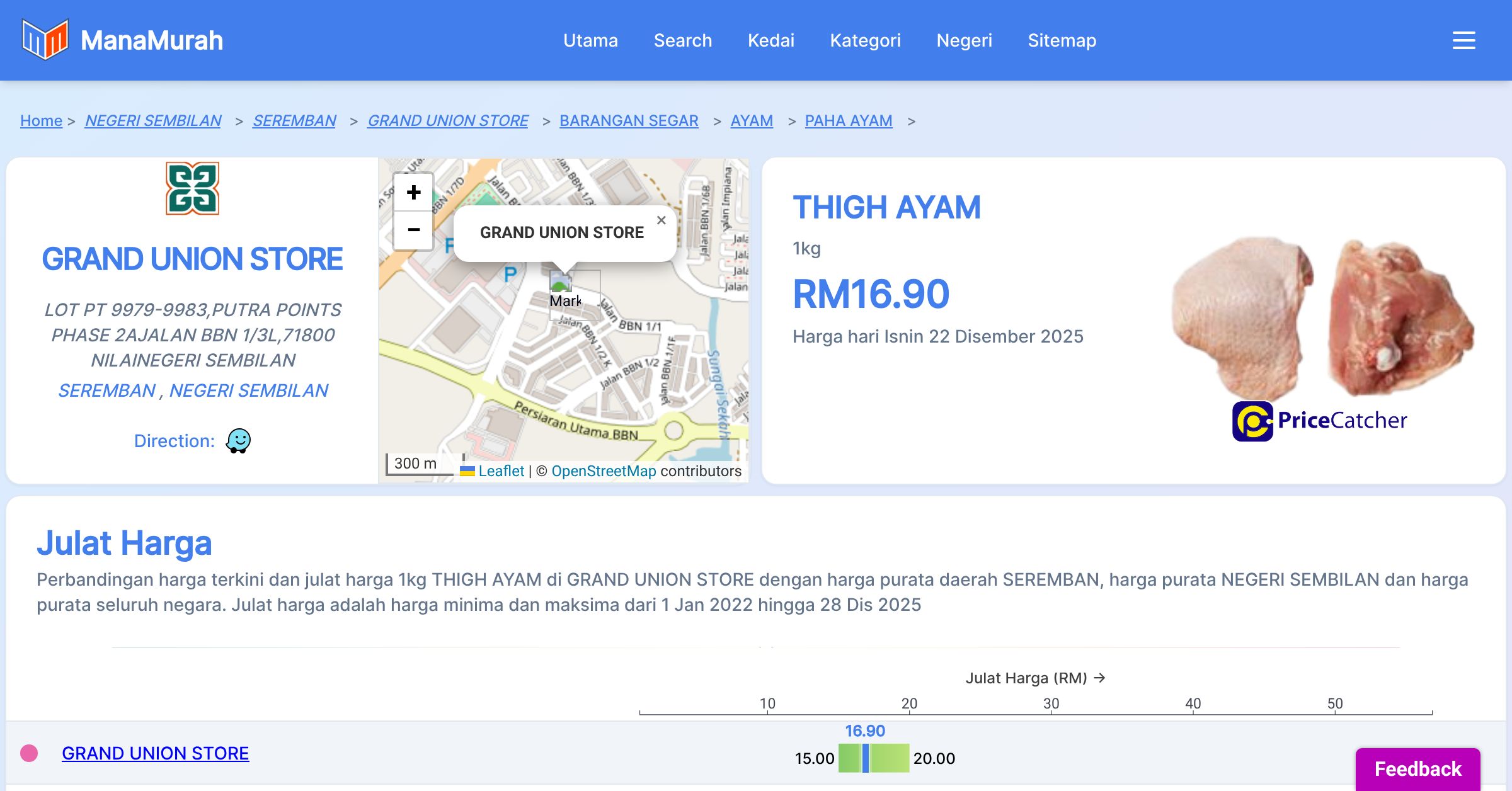 Perbandingan harga terkini dan julat harga 1kg THIGH AYAM di GRAND UNION STORE dengan harga purata daerah SEREMBAN, harga purata NEGERI SEMBILAN dan harga purata seluruh negara. Julat harga adalah harga minima dan maksima dari 1 Jan 2022 hingga 28 Dis 2025