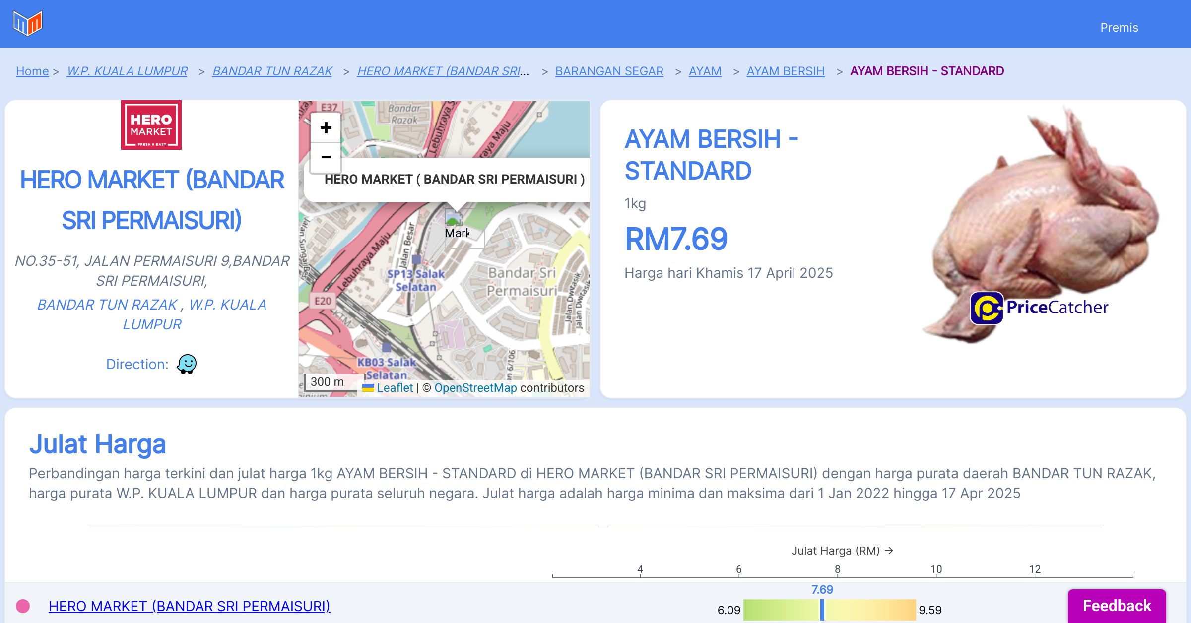 Harga purata tahunan 1kg AYAM BERSIH - STANDARD di HERO MARKET (BANDAR SRI PERMAISURI) berbanding harga purata daerah BANDAR TUN RAZAK, harga purata W.P. KUALA LUMPUR dan harga purata seluruh negara