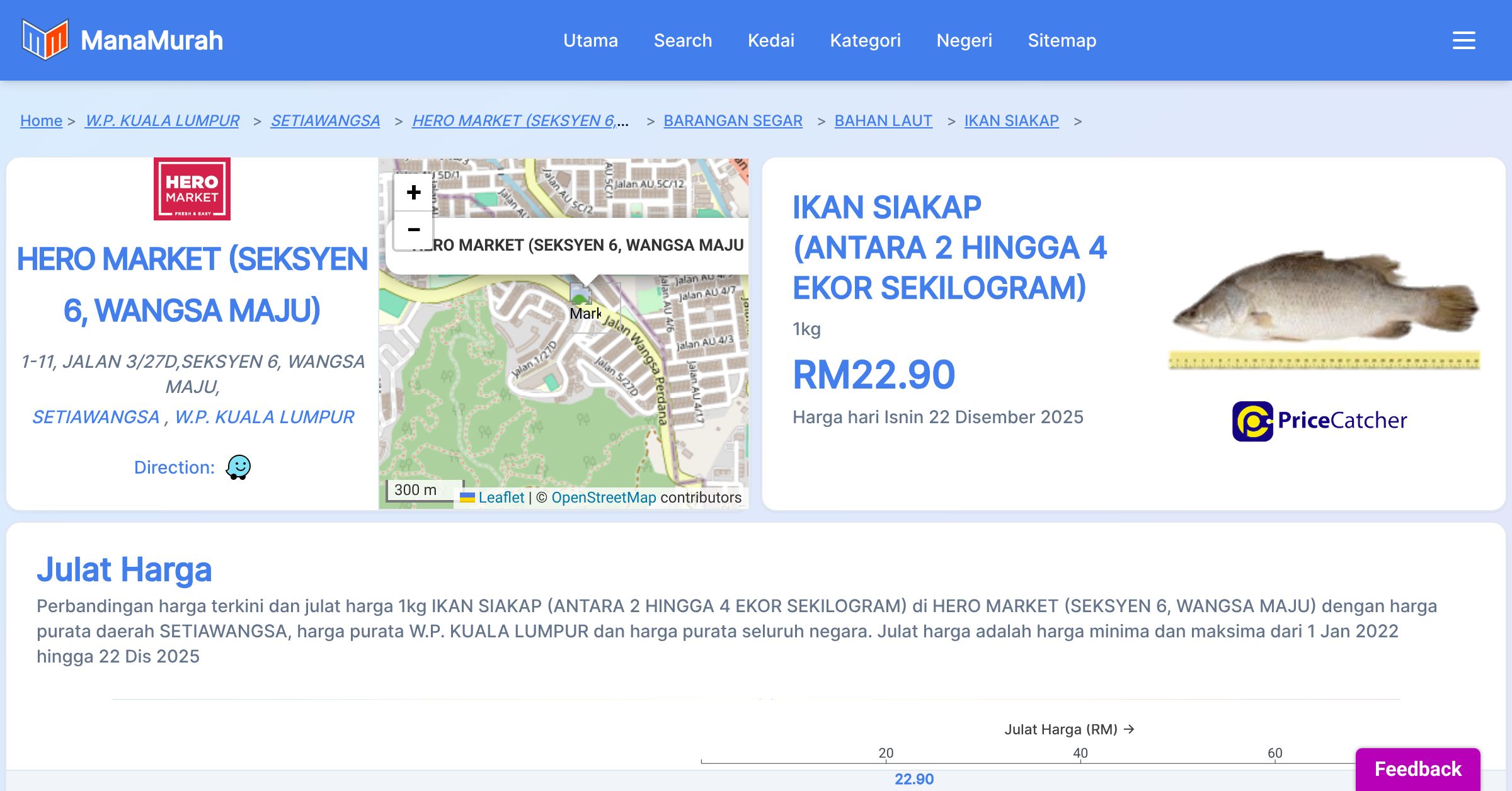 Perubahan harga purata mingguan 1kg IKAN SIAKAP (ANTARA 2 HINGGA 4 EKOR SEKILOGRAM) di HERO MARKET (SEKSYEN 6, WANGSA MAJU ) berbanding harga purata mingguan daerah SETIAWANGSA, harga purata mingguan negeri W.P. KUALA LUMPUR dan harga purata mingguan seluruh negara sehingga 22 Dis 2025