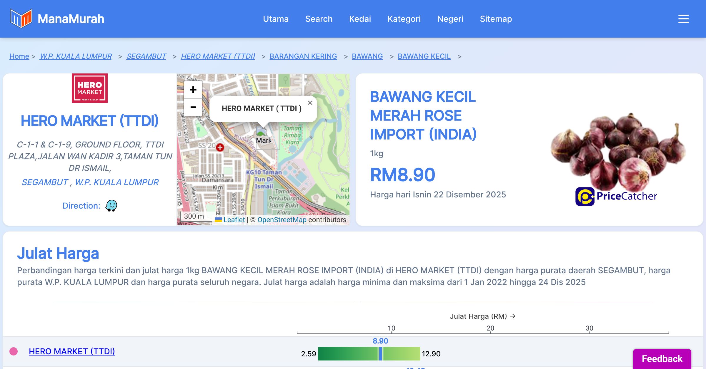 Perbandingan harga terkini dan julat harga 1kg BAWANG KECIL MERAH ROSE IMPORT (INDIA) di HERO MARKET (TTDI) dengan harga purata daerah SEGAMBUT, harga purata W.P. KUALA LUMPUR dan harga purata seluruh negara. Julat harga adalah harga minima dan maksima dari 1 Jan 2022 hingga 24 Dis 2025