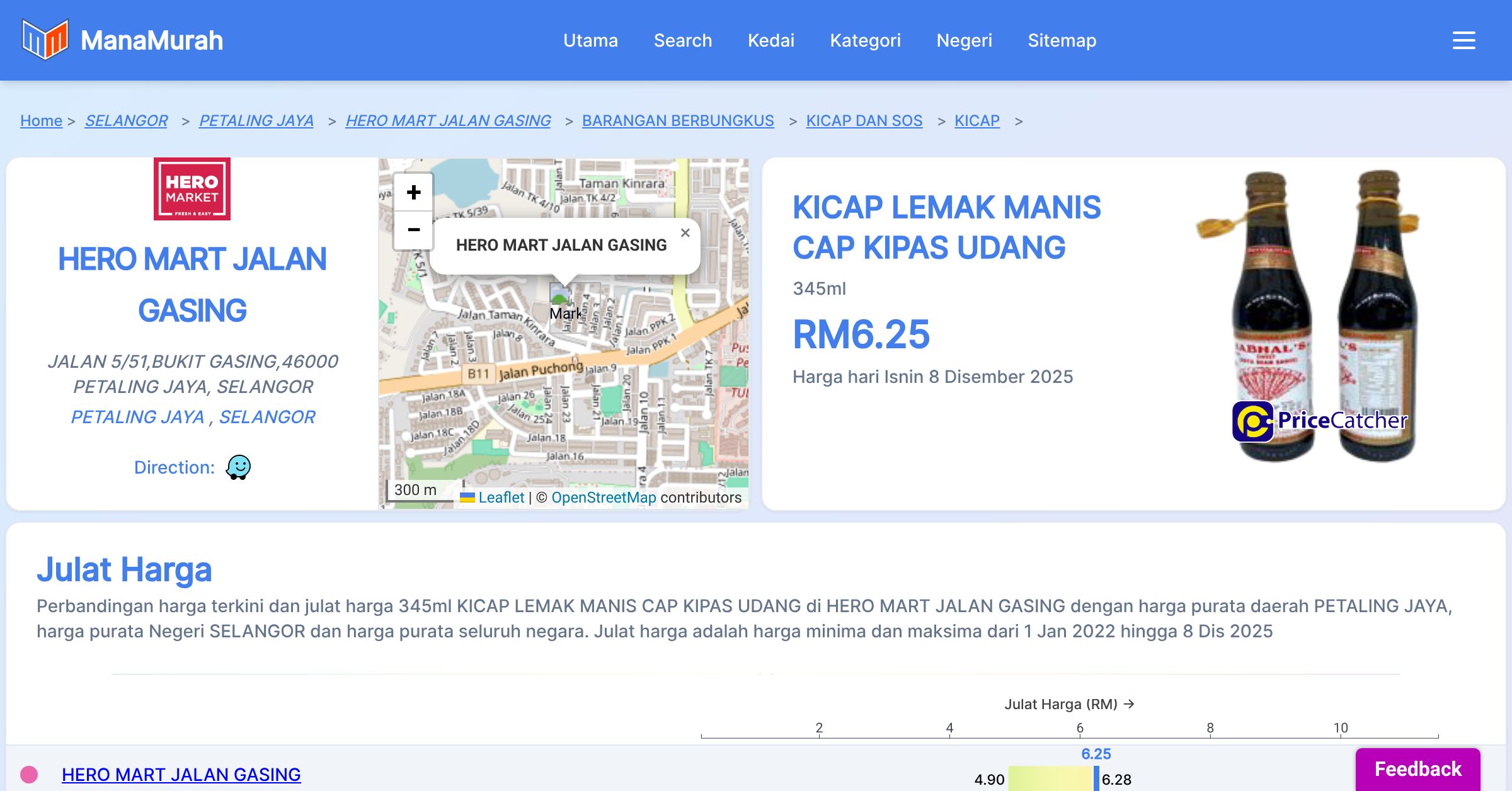 Perbandingan harga terkini dan julat harga 345ml KICAP LEMAK MANIS CAP KIPAS UDANG di HERO MART JALAN GASING dengan harga purata daerah PETALING JAYA, harga purata Negeri SELANGOR dan harga purata seluruh negara. Julat harga adalah harga minima dan maksima dari 1 Jan 2022 hingga 8 Dis 2025