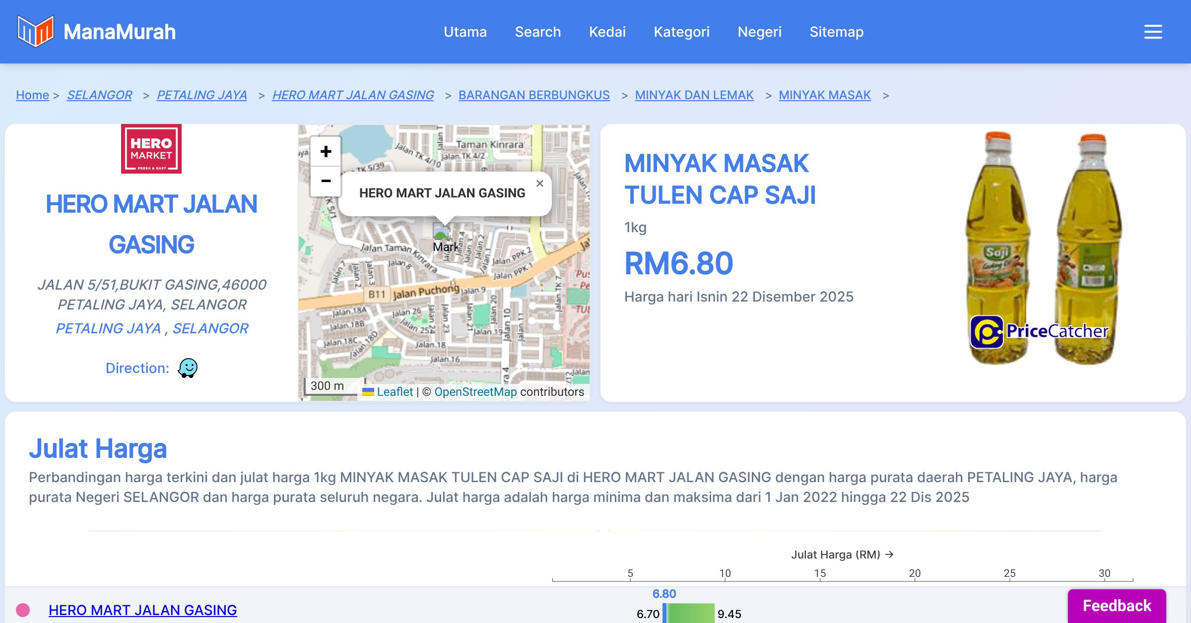 Harga purata bulanan 1kg MINYAK MASAK TULEN CAP SAJI di HERO MART JALAN GASING berbanding harga purata daerah PETALING JAYA, harga purata Negeri SELANGOR dan harga purata seluruh negara