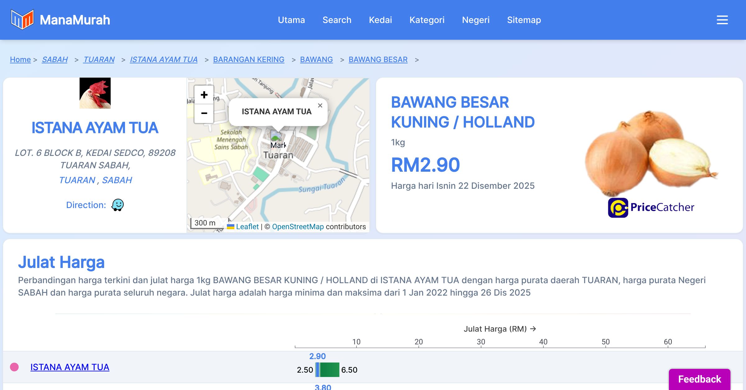 Harga purata tahunan 1kg BAWANG BESAR KUNING / HOLLAND di ISTANA AYAM TUA berbanding harga purata daerah TUARAN, harga purata Negeri SABAH dan harga purata seluruh negara
