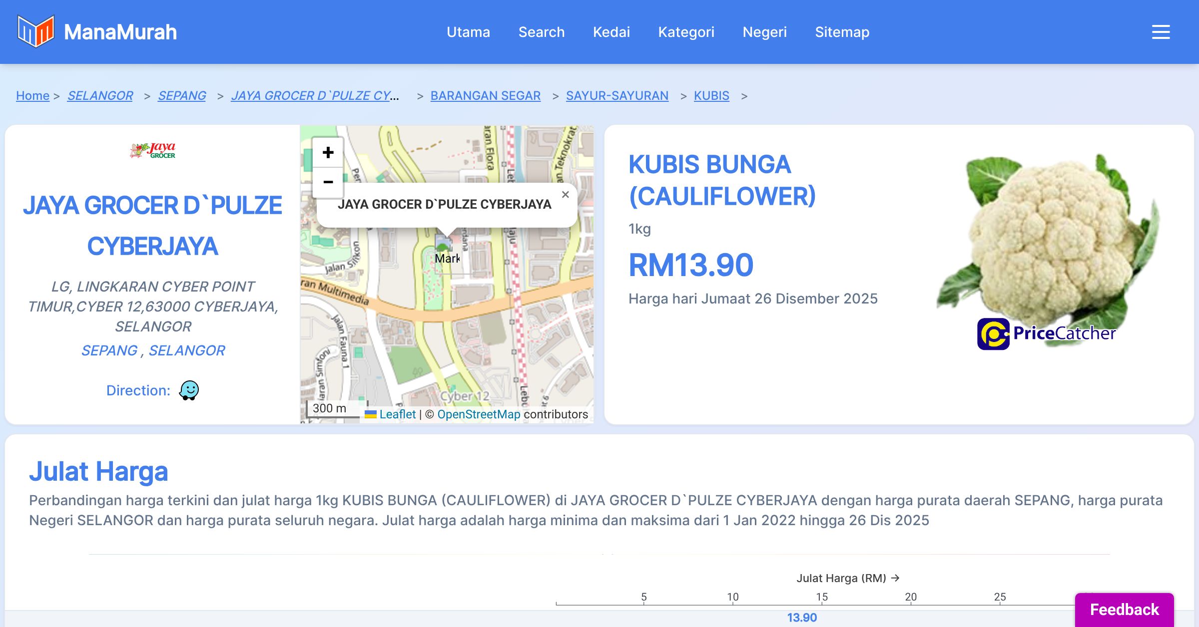 Harga purata bulanan 1kg KUBIS BUNGA (CAULIFLOWER) di JAYA GROCER D`PULZE CYBERJAYA berbanding harga purata daerah SEPANG, harga purata Negeri SELANGOR dan harga purata seluruh negara