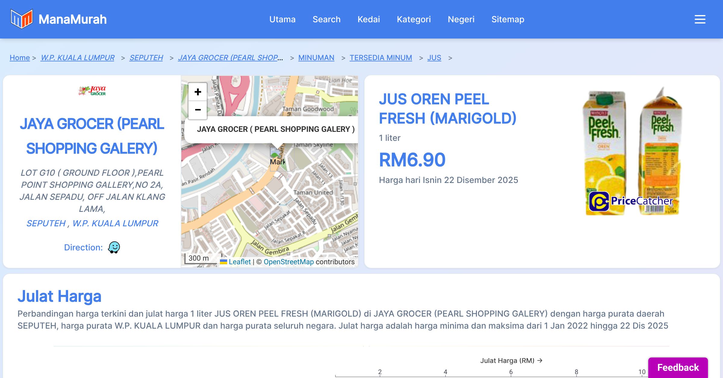 Perubahan harga purata mingguan 1 liter JUS OREN PEEL FRESH (MARIGOLD) di JAYA GROCER ( PEARL SHOPPING GALERY ) berbanding harga purata mingguan daerah SEPUTEH, harga purata mingguan negeri W.P. KUALA LUMPUR dan harga purata mingguan seluruh negara sehingga 22 Dis 2025