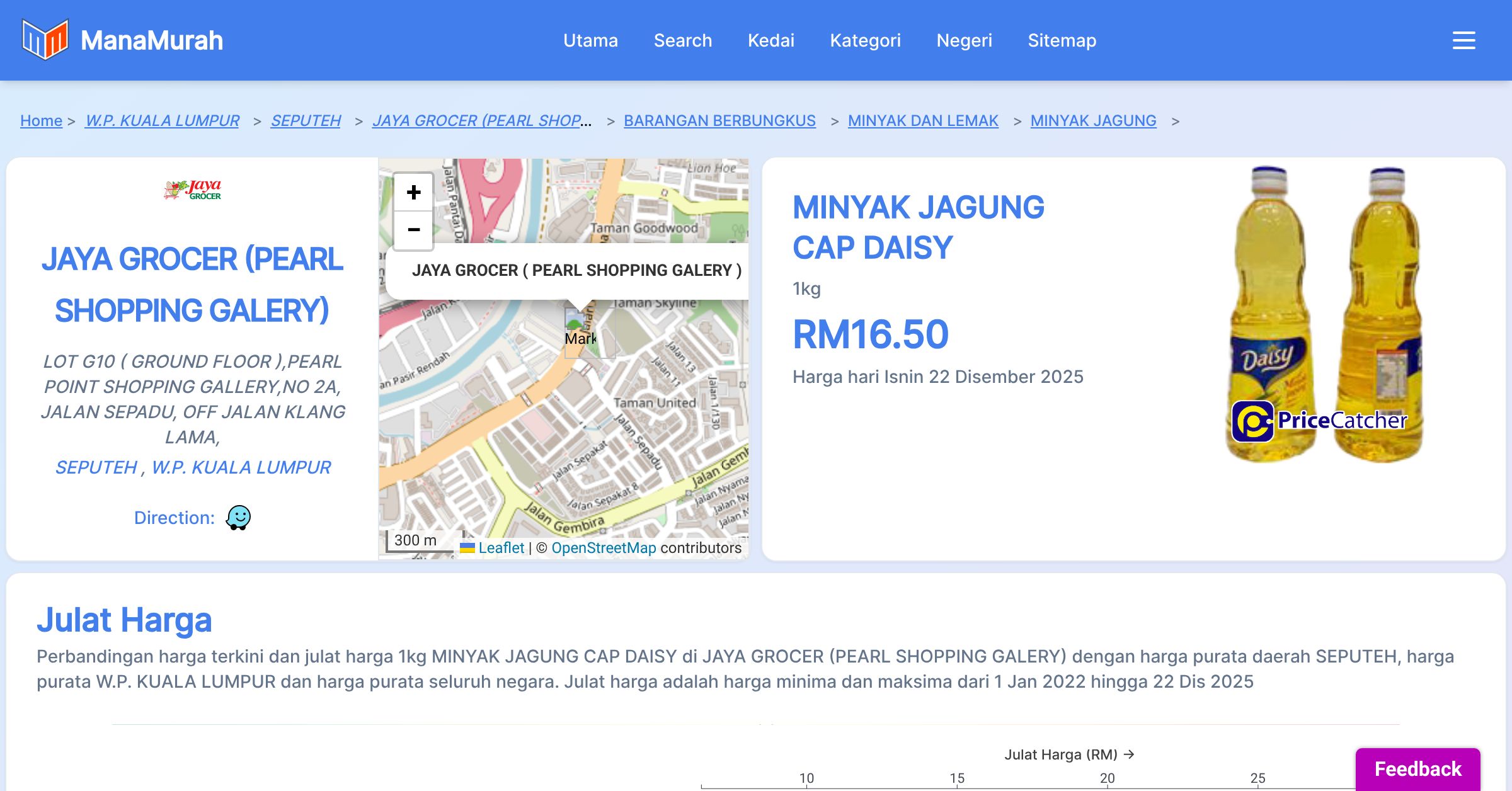 Perubahan harga purata mingguan 1kg MINYAK JAGUNG CAP DAISY di JAYA GROCER ( PEARL SHOPPING GALERY ) berbanding harga purata mingguan daerah SEPUTEH, harga purata mingguan negeri W.P. KUALA LUMPUR dan harga purata mingguan seluruh negara sehingga 22 Dis 2025
