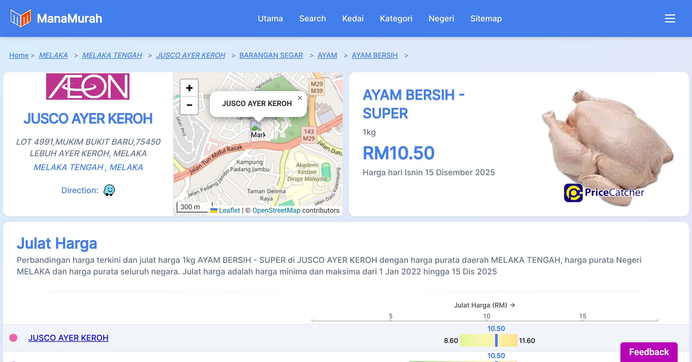 Perbandingan harga terkini dan julat harga 1kg AYAM BERSIH - SUPER di JUSCO AYER KEROH dengan harga purata daerah MELAKA TENGAH, harga purata Negeri MELAKA dan harga purata seluruh negara. Julat harga adalah harga minima dan maksima dari 1 Jan 2022 hingga 3 Apr 2026
