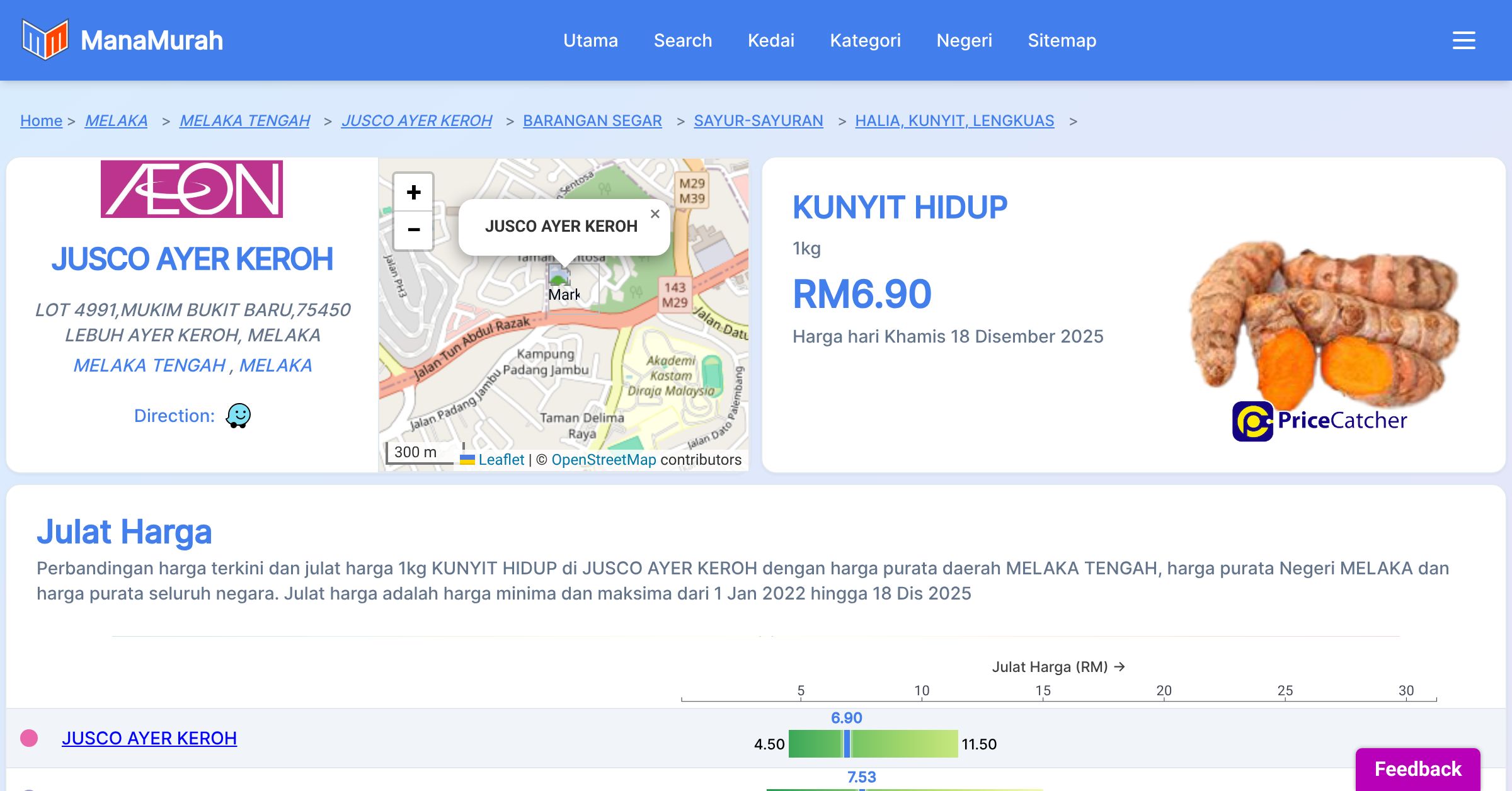 Perubahan harga purata mingguan 1kg KUNYIT HIDUP di JUSCO AYER KEROH berbanding harga purata mingguan daerah MELAKA TENGAH, harga purata mingguan negeri MELAKA dan harga purata mingguan seluruh negara sehingga 18 Dis 2025
