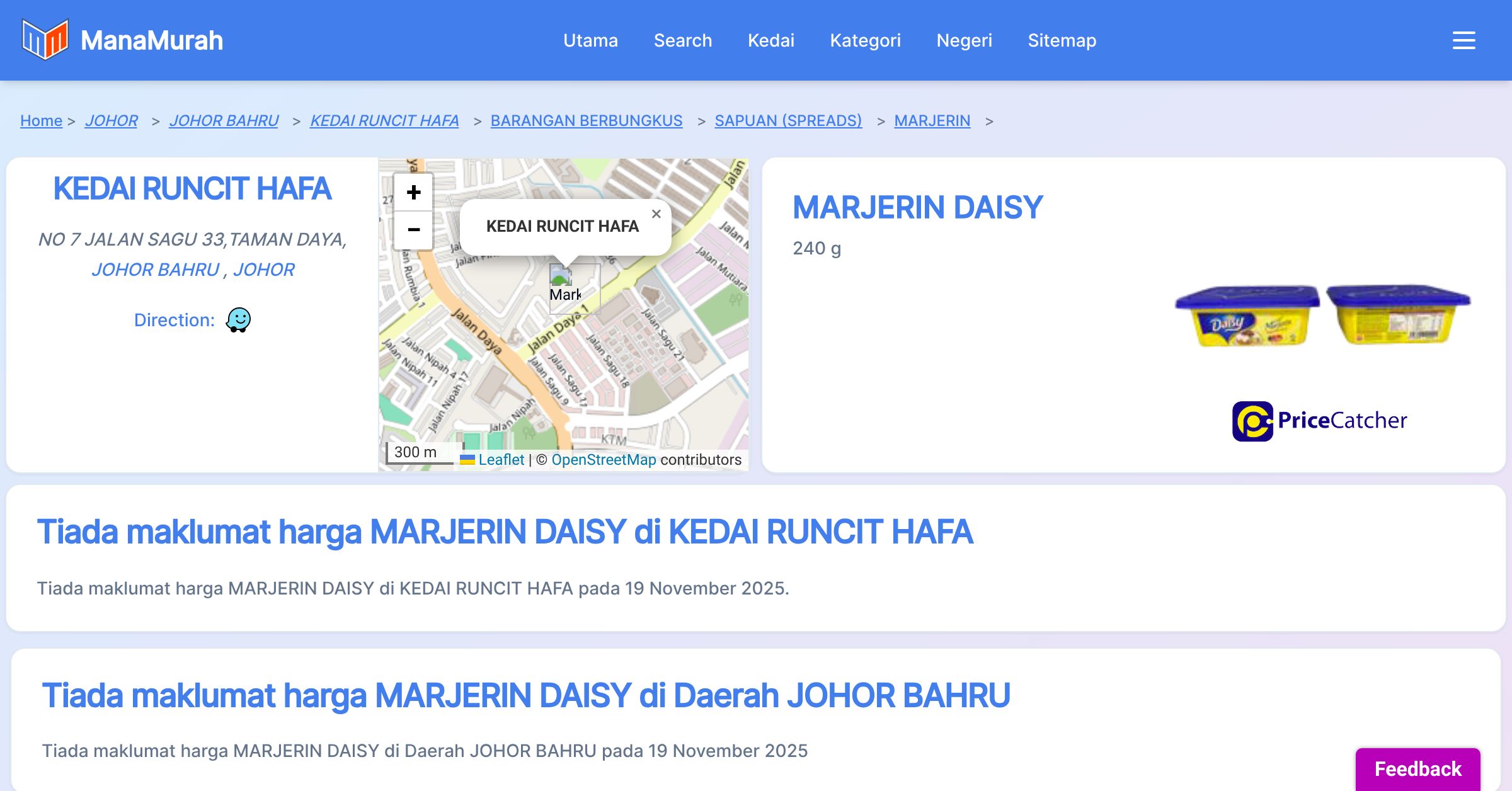 Harga purata tahunan 240 g MARJERIN DAISY di KEDAI RUNCIT HAFA berbanding harga purata daerah JOHOR BAHRU, harga purata Negeri JOHOR dan harga purata seluruh negara