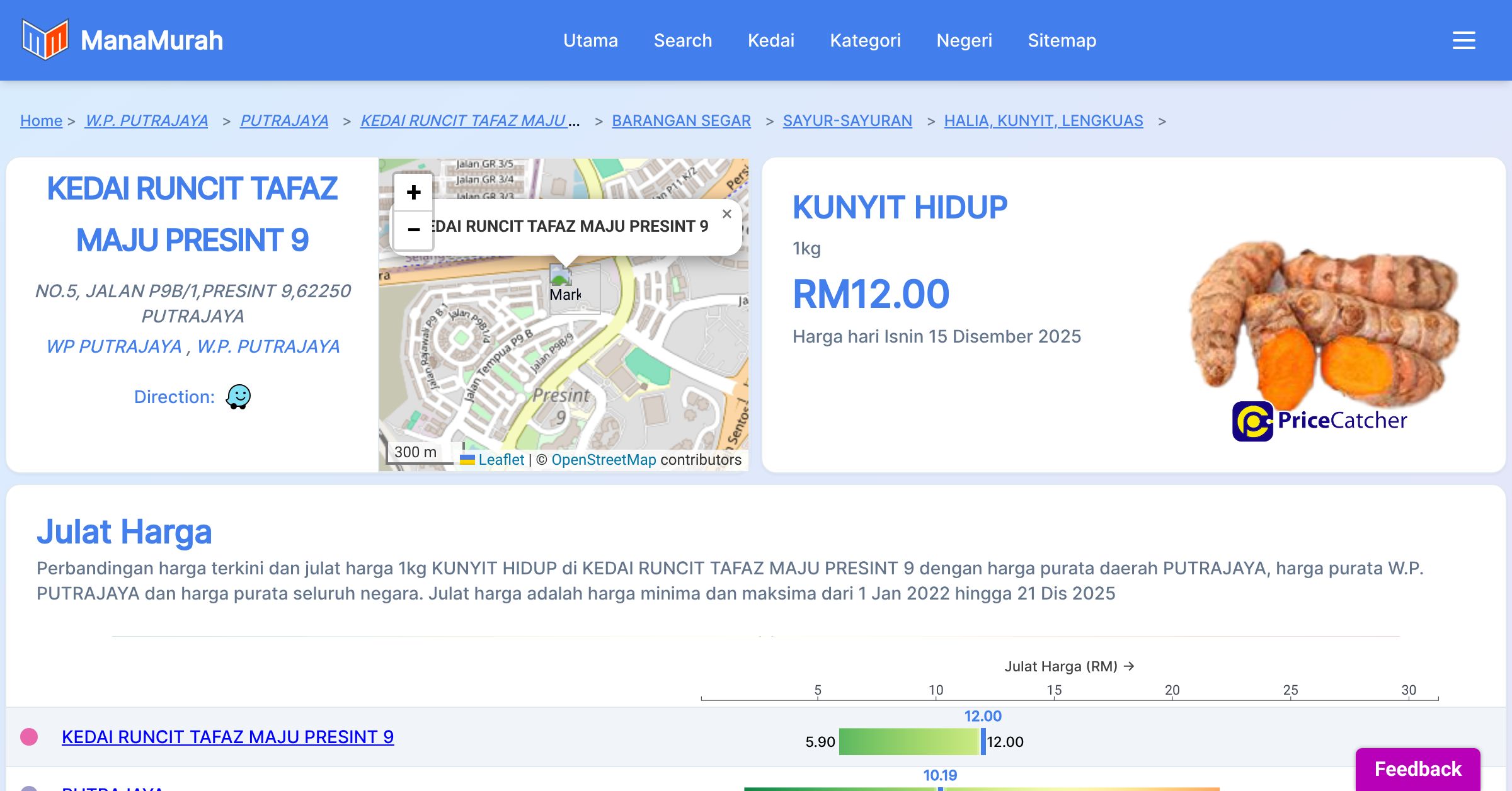 Perbandingan harga terkini dan julat harga 1kg KUNYIT HIDUP di KEDAI RUNCIT TAFAZ MAJU PRESINT 9 dengan harga purata daerah PUTRAJAYA, harga purata W.P. PUTRAJAYA dan harga purata seluruh negara. Julat harga adalah harga minima dan maksima dari 1 Jan 2022 hingga 21 Dis 2025
