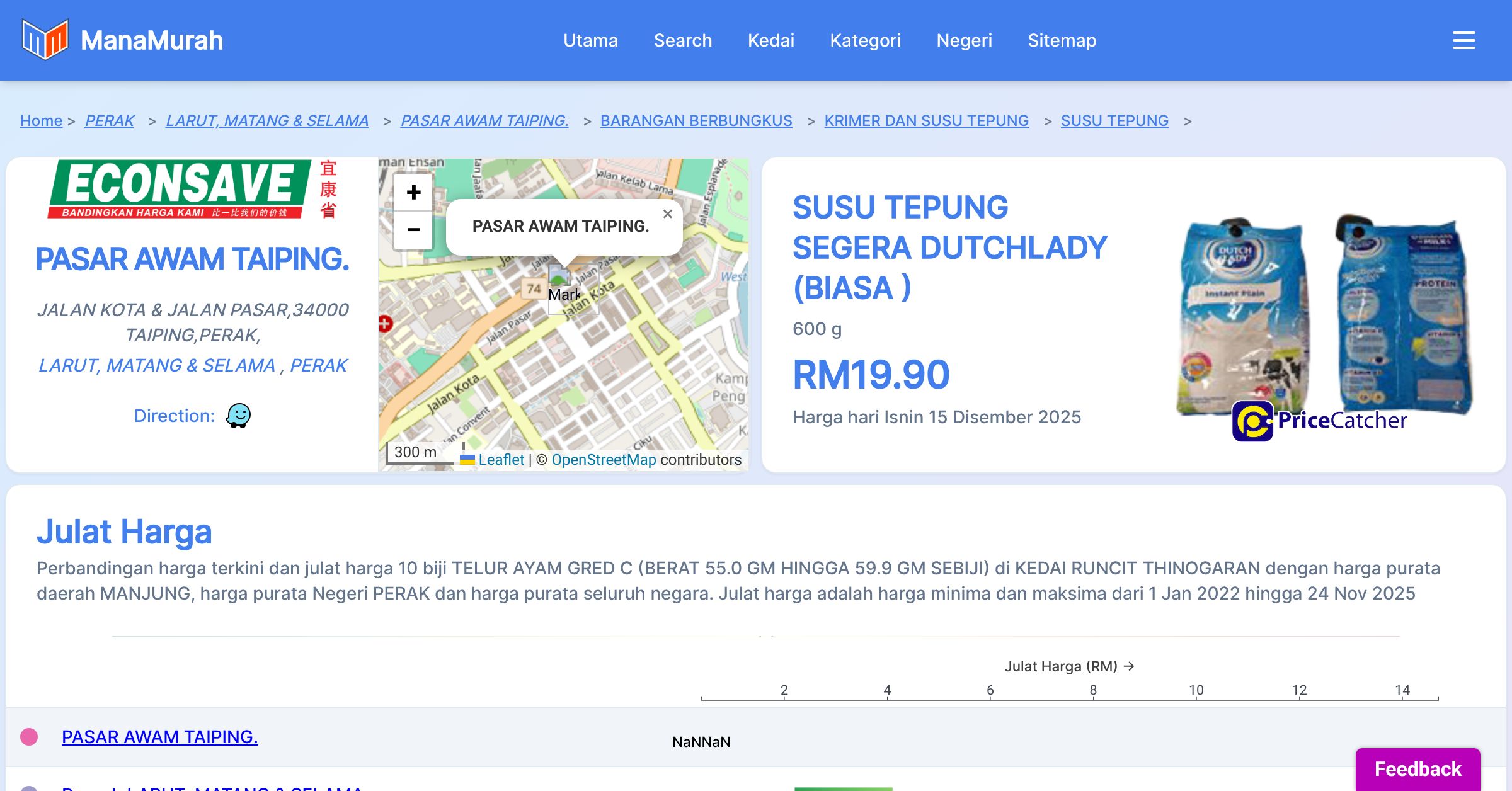 Perbandingan harga terkini dan julat harga 10 biji TELUR AYAM GRED C (BERAT 55.0 GM HINGGA 59.9 GM SEBIJI) di KEDAI RUNCIT THINOGARAN dengan harga purata daerah MANJUNG, harga purata Negeri PERAK dan harga purata seluruh negara. Julat harga adalah harga minima dan maksima dari 1 Jan 2022 hingga 24 Nov 2025