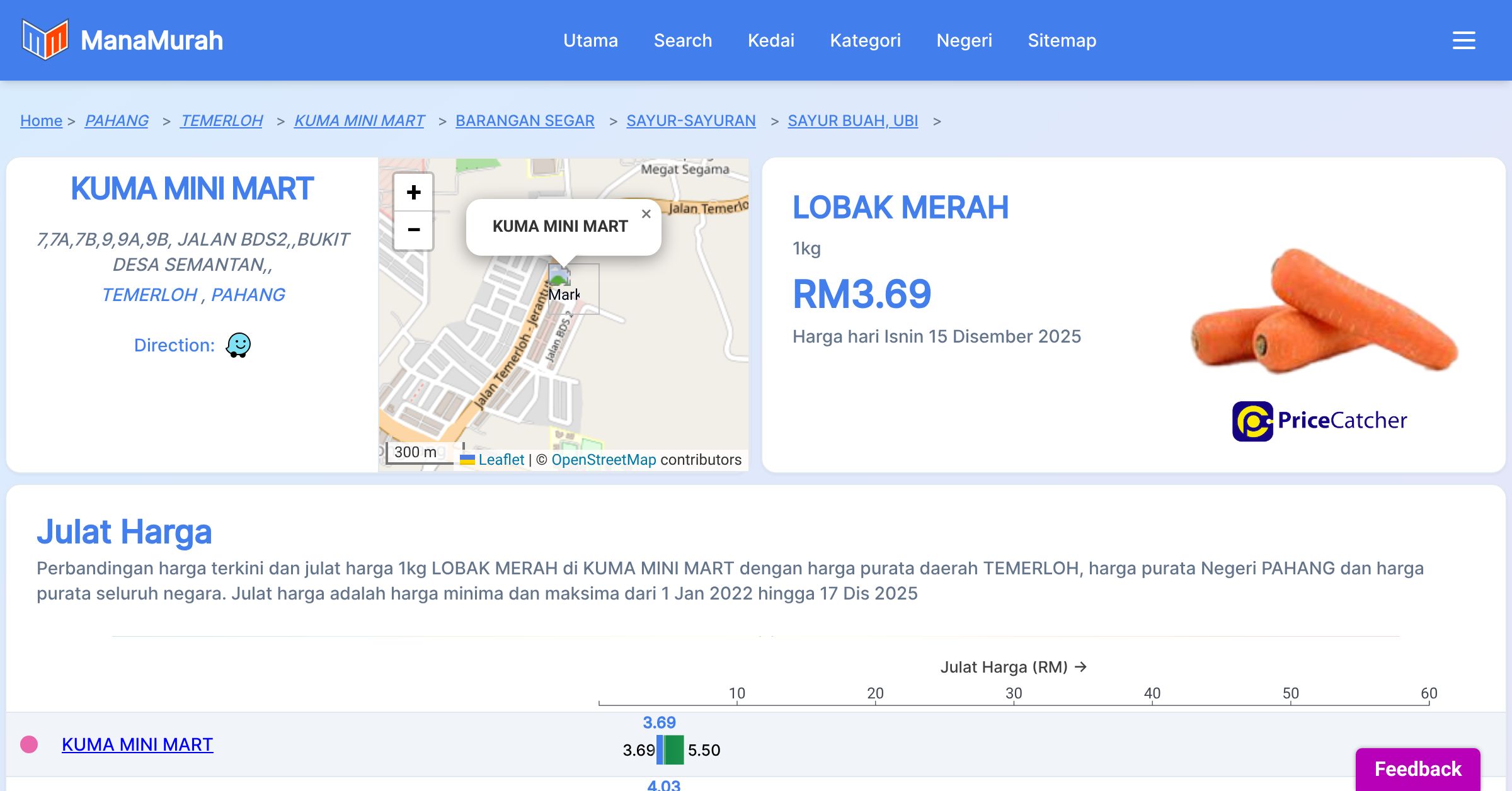 Perbandingan harga terkini dan julat harga 1kg LOBAK MERAH di KUMA MINI MART dengan harga purata daerah TEMERLOH, harga purata Negeri PAHANG dan harga purata seluruh negara. Julat harga adalah harga minima dan maksima dari 1 Jan 2022 hingga 17 Dis 2025