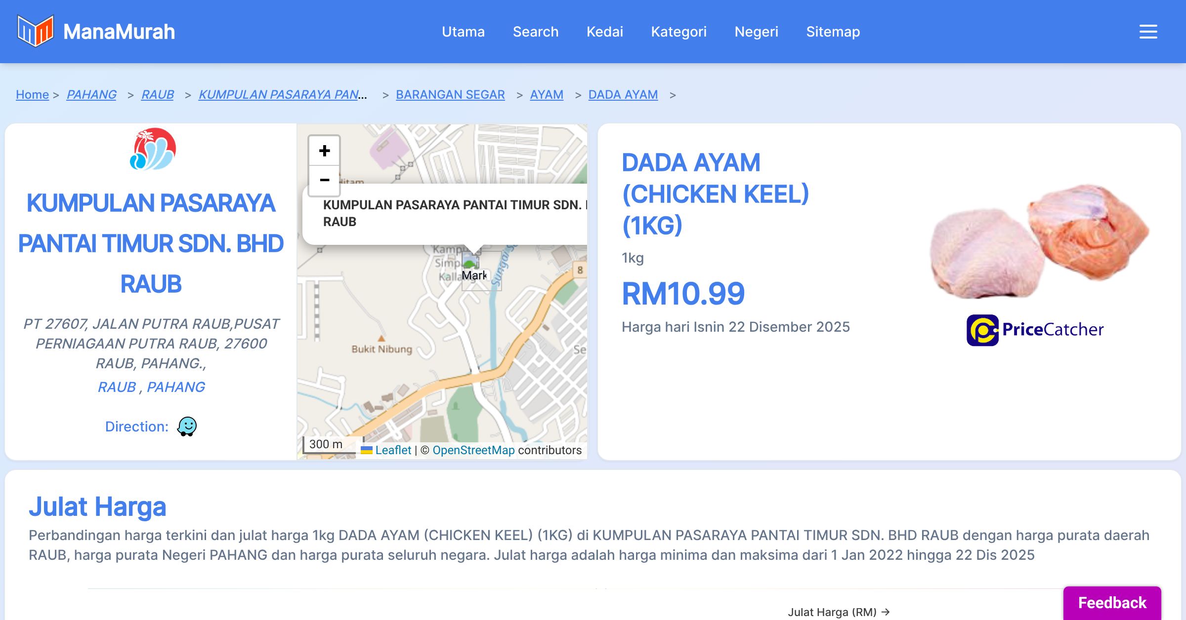 Perbandingan harga terkini dan julat harga 1kg DADA AYAM (CHICKEN KEEL) (1KG) di KUMPULAN PASARAYA PANTAI TIMUR SDN. BHD RAUB dengan harga purata daerah RAUB, harga purata Negeri PAHANG dan harga purata seluruh negara. Julat harga adalah harga minima dan maksima dari 1 Jan 2022 hingga 22 Dis 2025