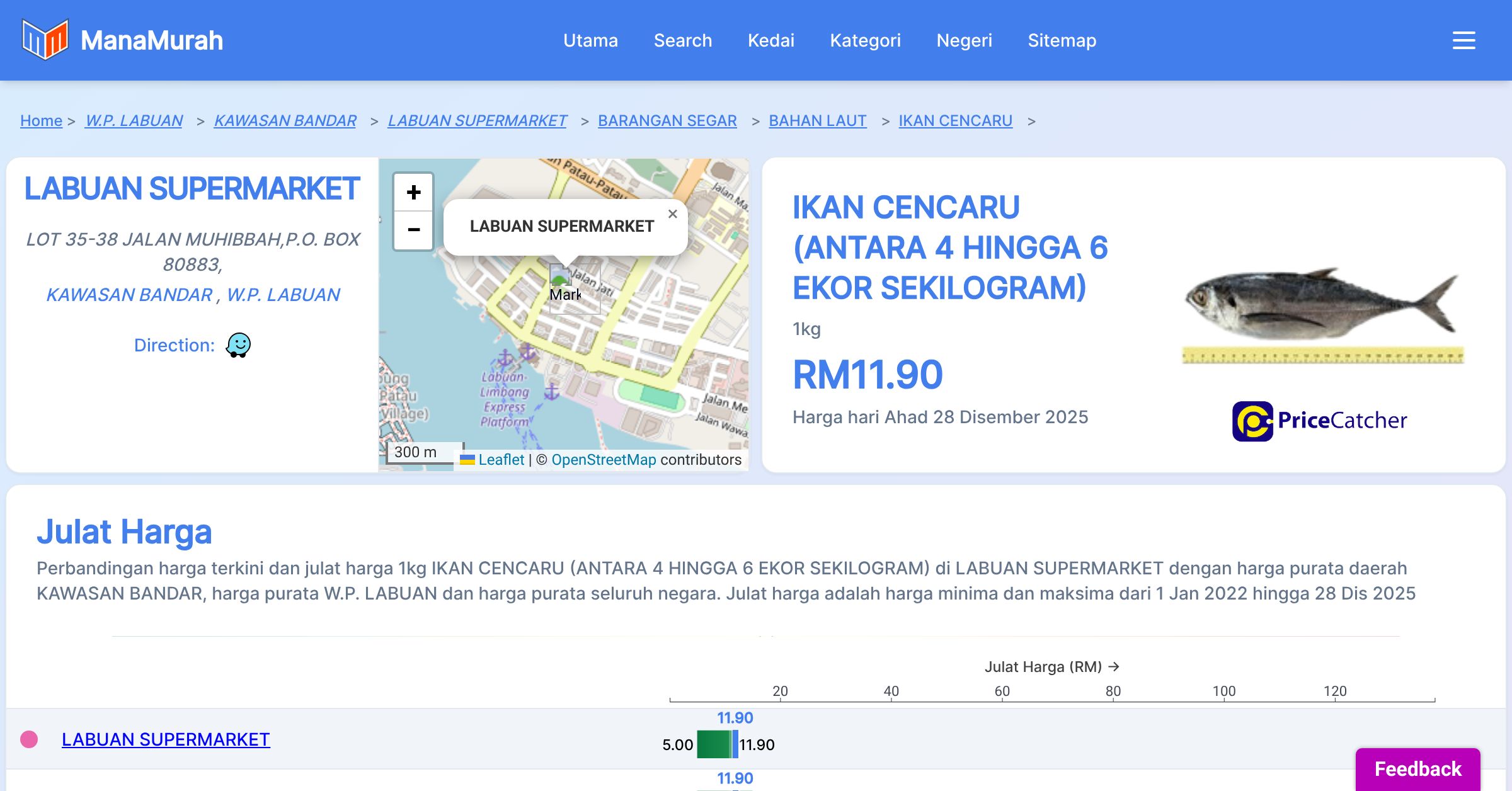 Perbandingan harga terkini dan julat harga 1kg IKAN CENCARU (ANTARA 4 HINGGA 6 EKOR SEKILOGRAM) di LABUAN SUPERMARKET dengan harga purata daerah KAWASAN BANDAR, harga purata W.P. LABUAN dan harga purata seluruh negara. Julat harga adalah harga minima dan maksima dari 1 Jan 2022 hingga 28 Dis 2025