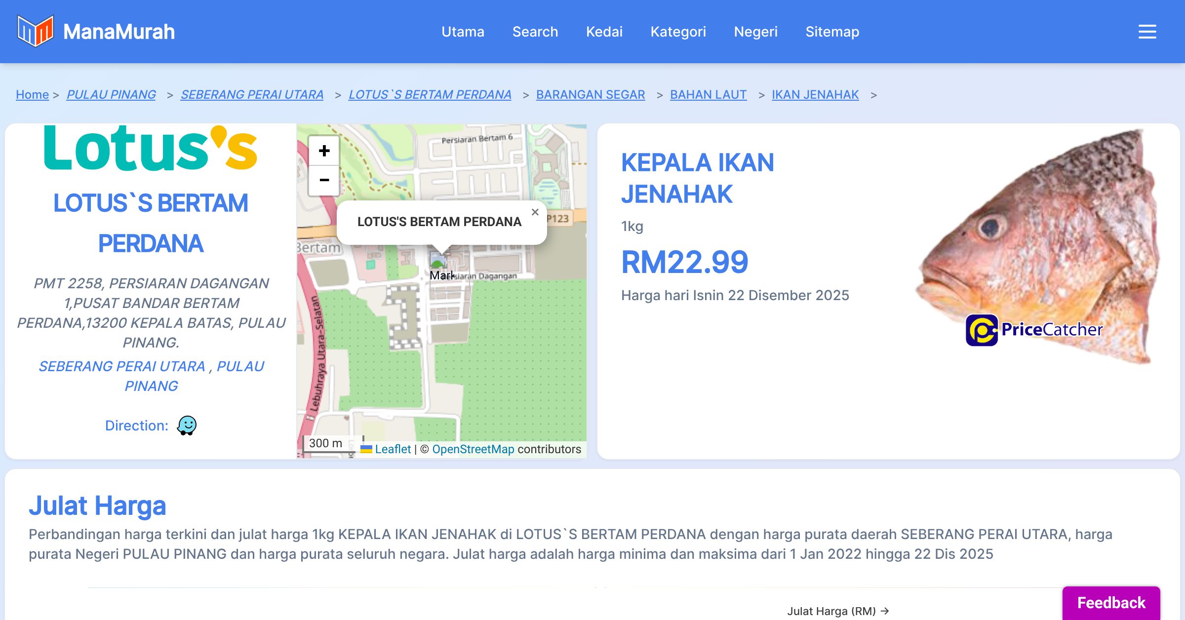 Perubahan harga purata mingguan 1kg KEPALA IKAN JENAHAK di LOTUS'S BERTAM PERDANA berbanding harga purata mingguan daerah SEBERANG PERAI UTARA, harga purata mingguan negeri PULAU PINANG dan harga purata mingguan seluruh negara sehingga 22 Dis 2025