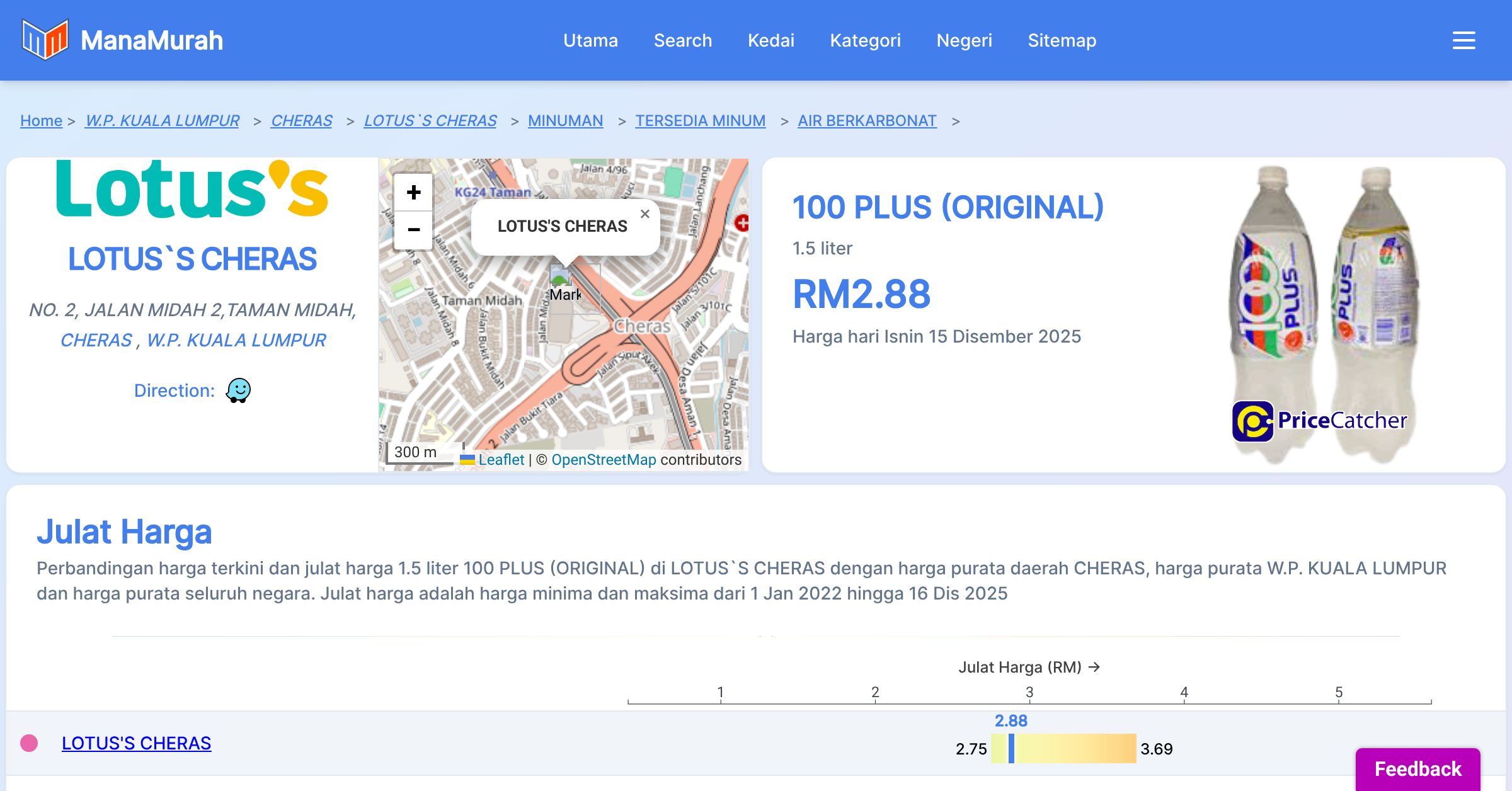 Perbandingan harga terkini dan julat harga 1.5 liter 100 PLUS (ORIGINAL) di LOTUS`S CHERAS dengan harga purata daerah CHERAS, harga purata W.P. KUALA LUMPUR dan harga purata seluruh negara. Julat harga adalah harga minima dan maksima dari 1 Jan 2022 hingga 16 Dis 2025