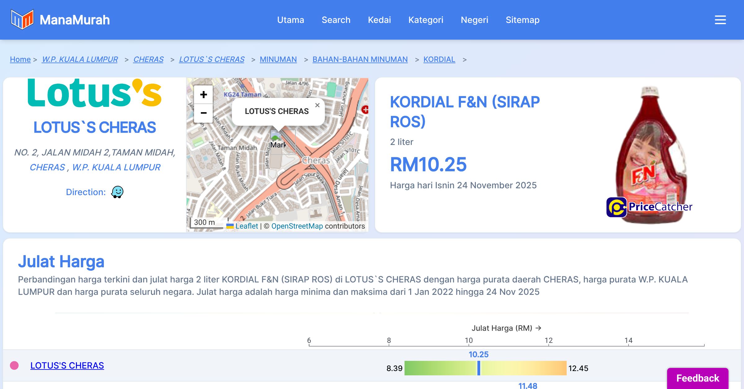 Perbandingan harga terkini dan julat harga 2 liter KORDIAL F&N (SIRAP ROS) di LOTUS`S CHERAS dengan harga purata daerah CHERAS, harga purata W.P. KUALA LUMPUR dan harga purata seluruh negara. Julat harga adalah harga minima dan maksima dari 1 Jan 2022 hingga 24 Nov 2025