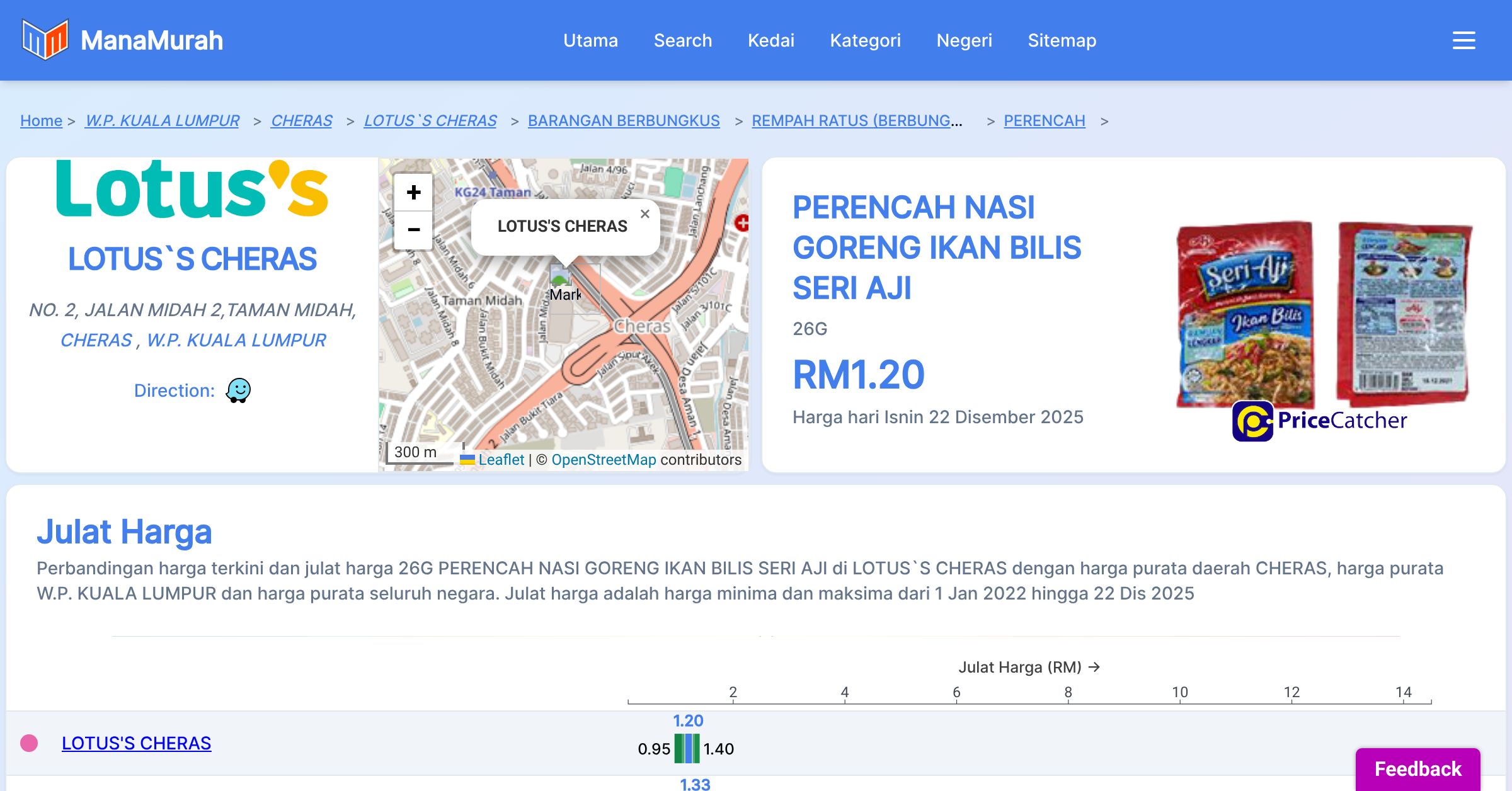 Perbandingan harga terkini dan julat harga 26G PERENCAH NASI GORENG IKAN BILIS SERI AJI di LOTUS`S CHERAS dengan harga purata daerah CHERAS, harga purata W.P. KUALA LUMPUR dan harga purata seluruh negara. Julat harga adalah harga minima dan maksima dari 1 Jan 2022 hingga 22 Dis 2025